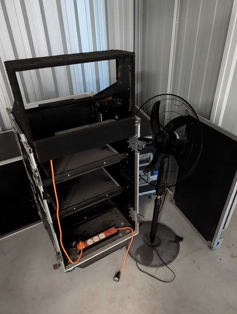 Production Power: Large black pedestal cooling fan and a heavy-duty power pack with extension leads.