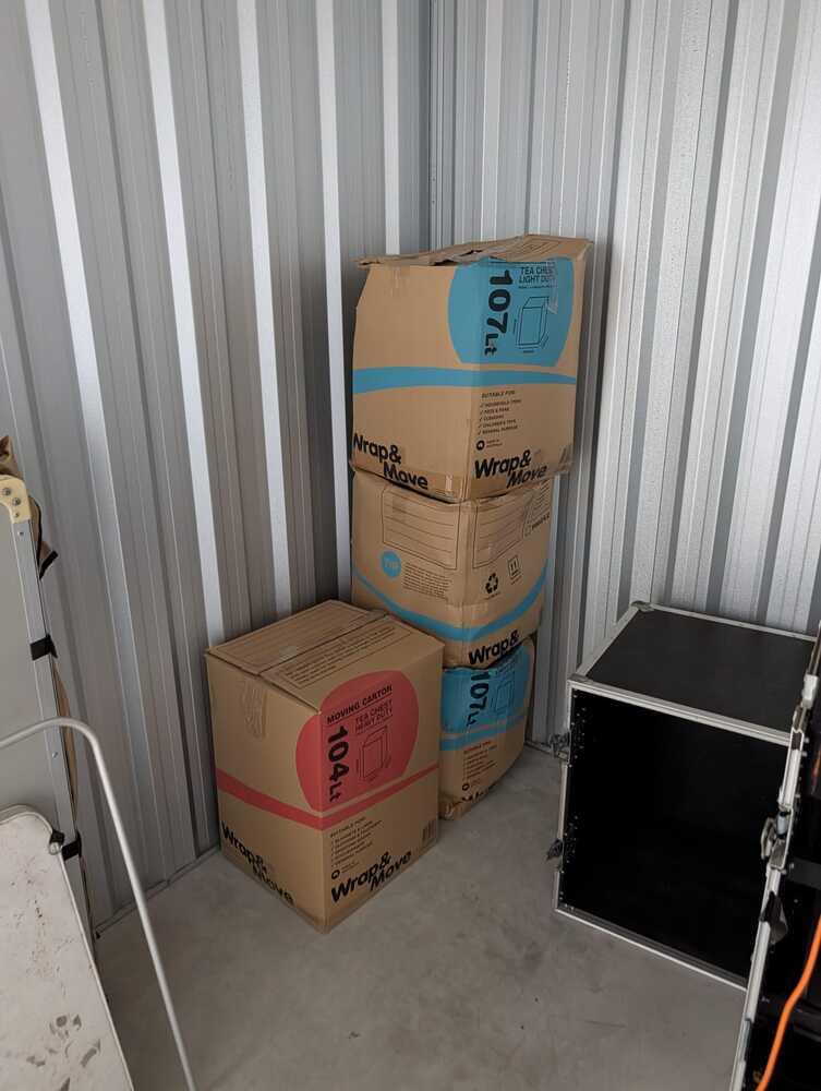 Moving Inventory: Four large "Wrap & Move" tea chest cartons. Sealed and stacked