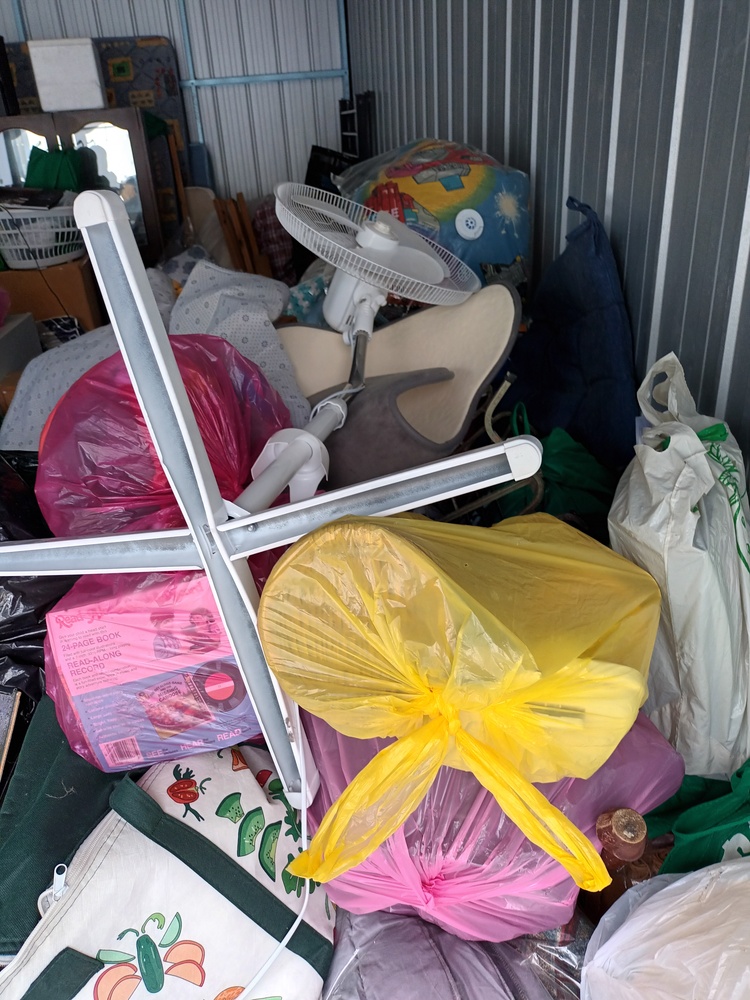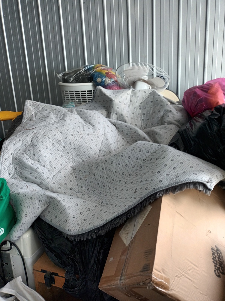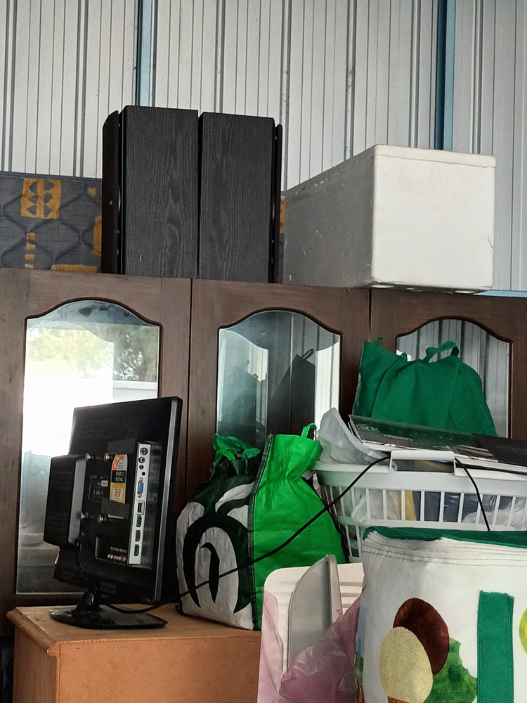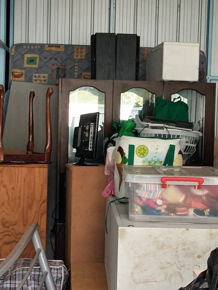 This unit contains a mix of misc. household items such as but not limited to bed frames, mattresses, drawers, fridge, blankets bags of misc. items. brooms and other such equipment, kitchenware, speakers a tv monitor, box of dolls and so forth