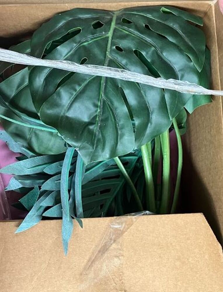 Box with fake plant, misc