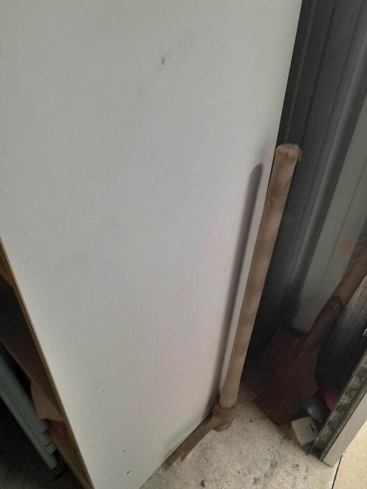 Bed bases and mattresses, fridge freezer, chest of drawers, microwave, air fryer, mattock, shovel, shelf unit, 4 x metal chairs, assorted household goods