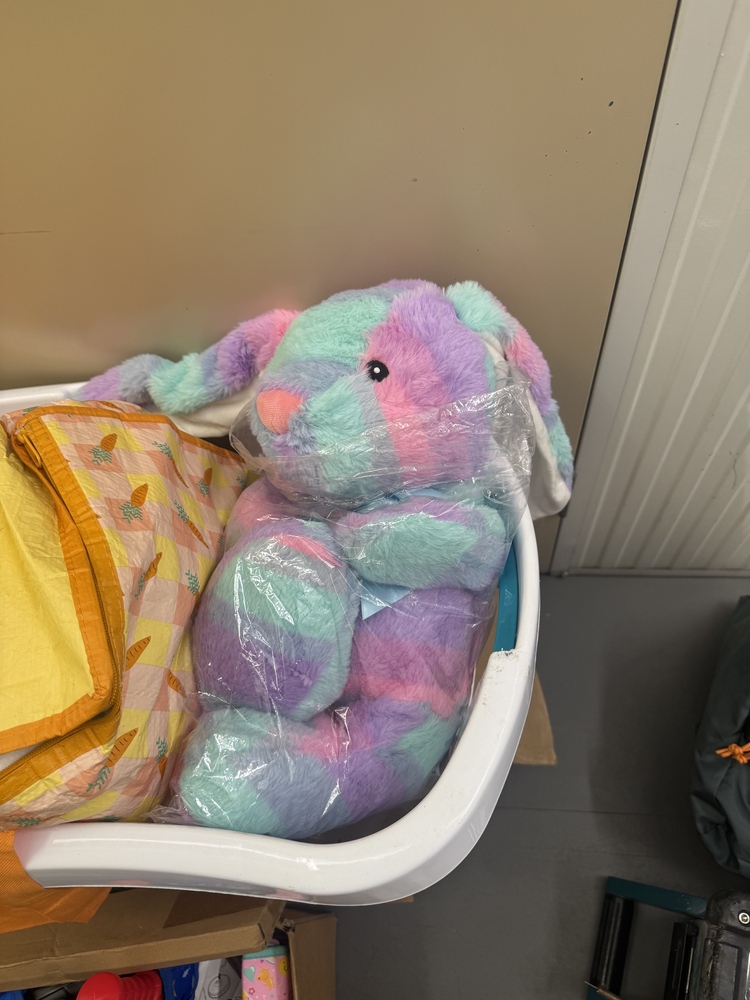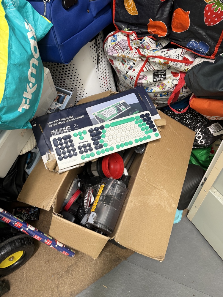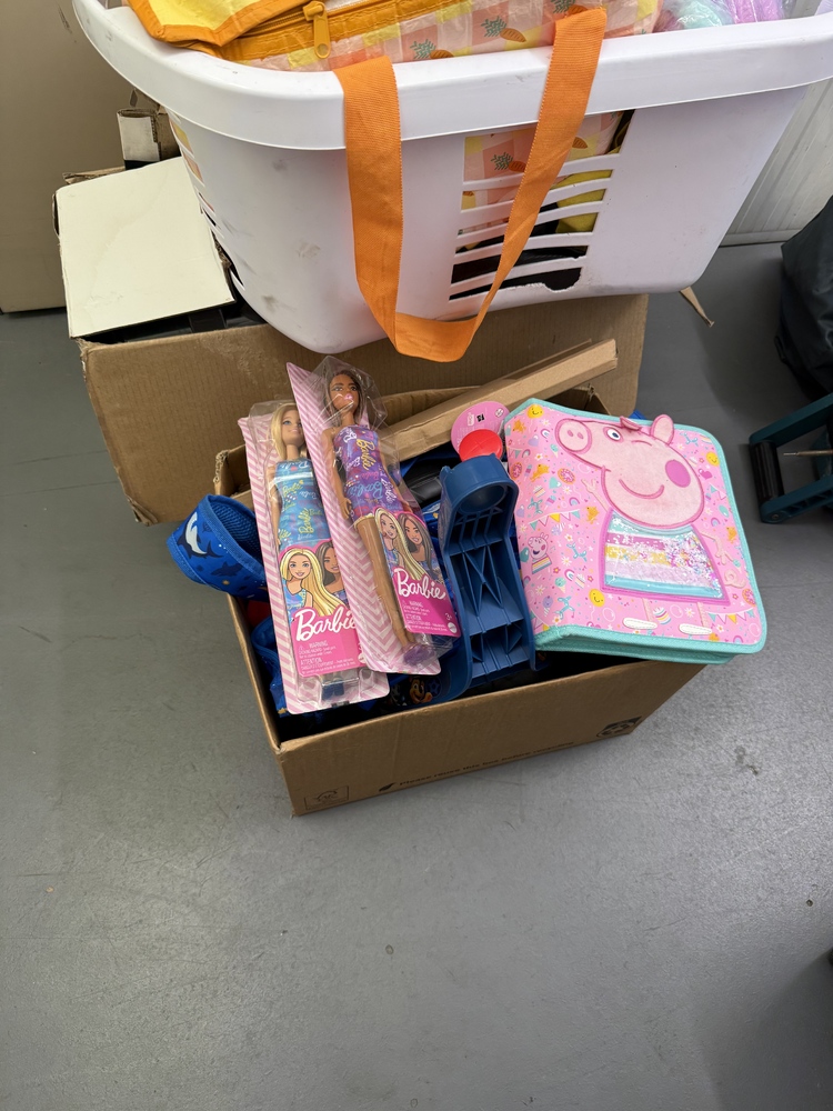 New items mixed with kids toys and electronics. Goods stored in luggage that are in good condition.