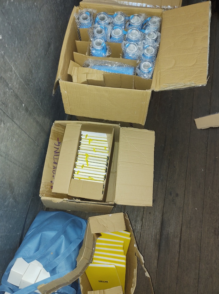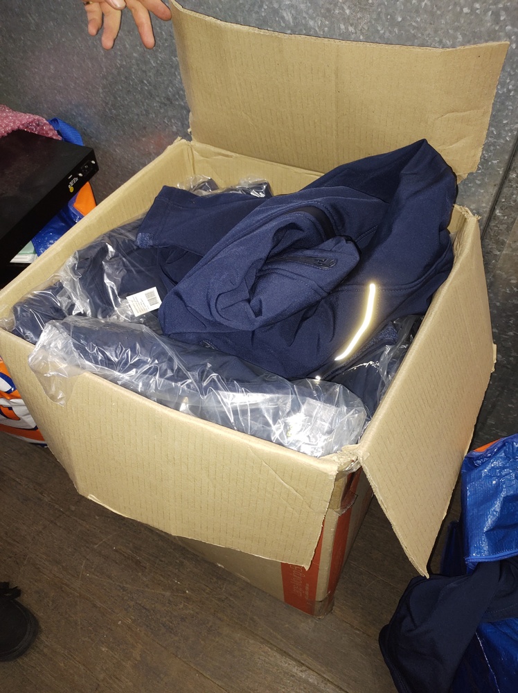 Boxes of uniforms and fabric