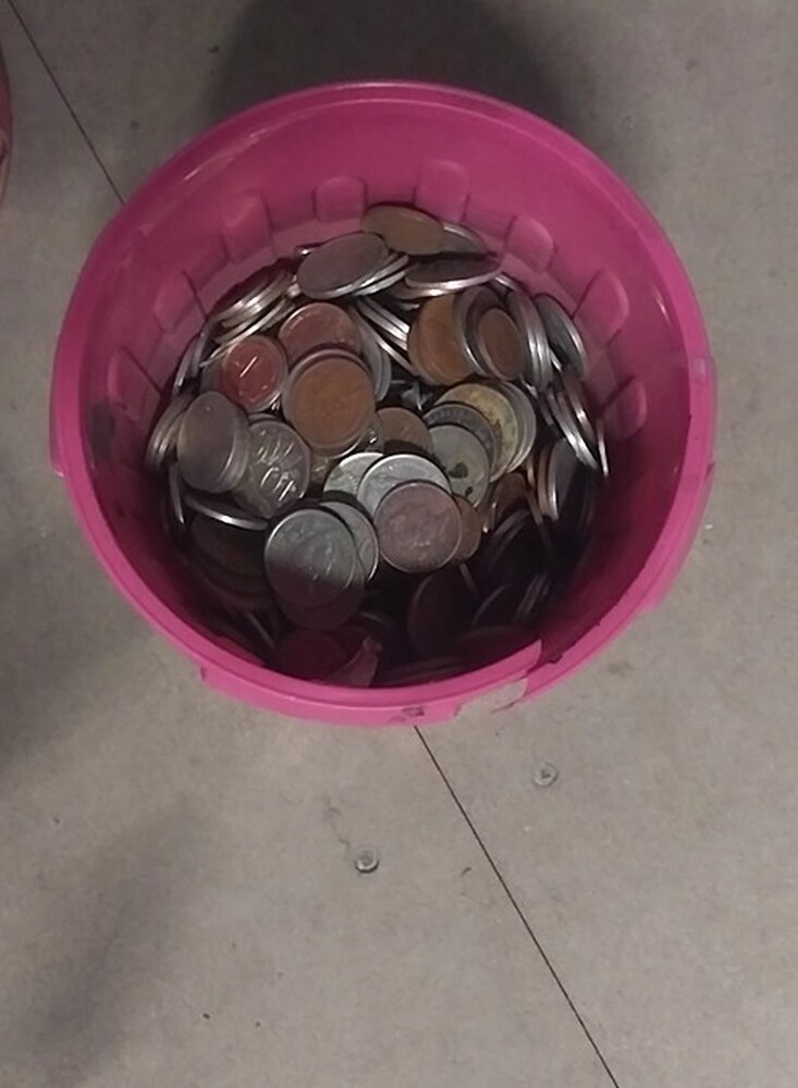 Small plastic bin of coins - It has not been counted full of change
