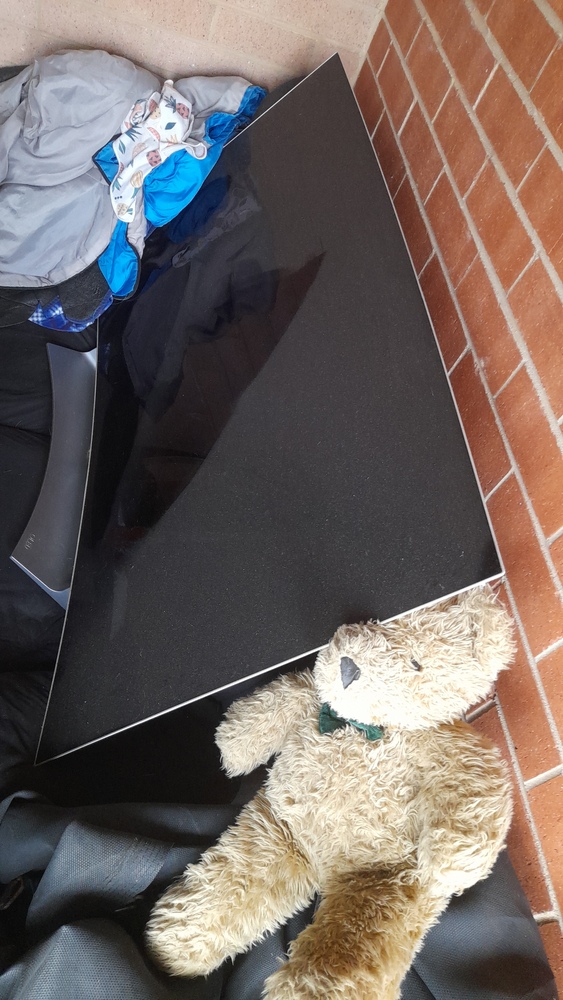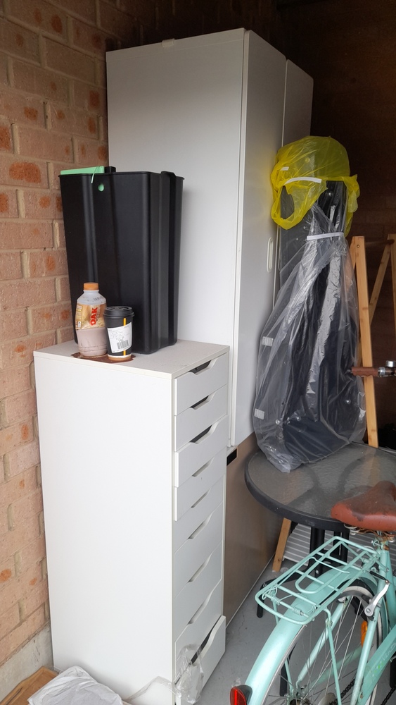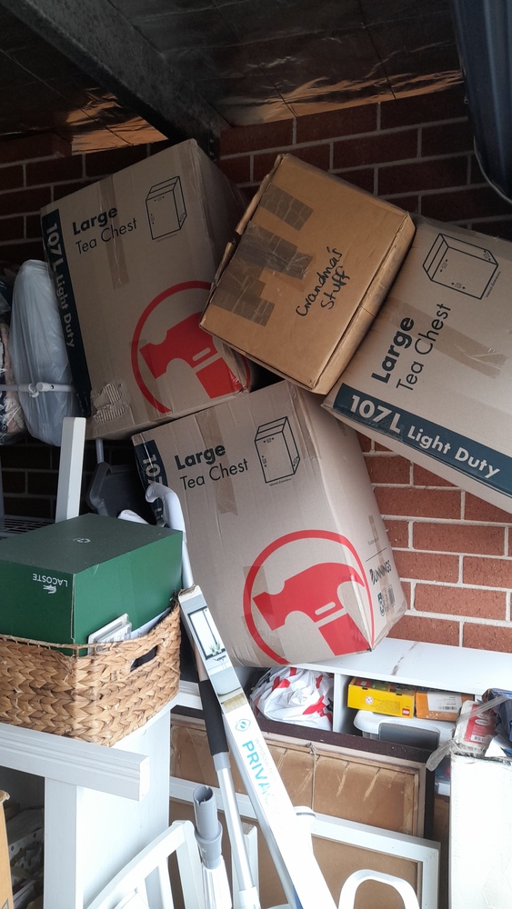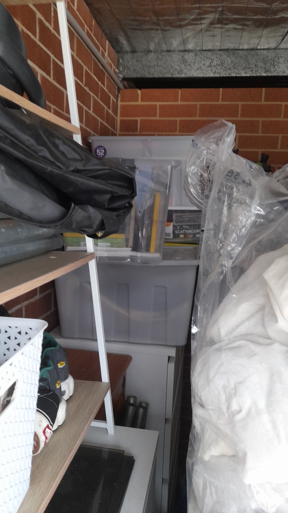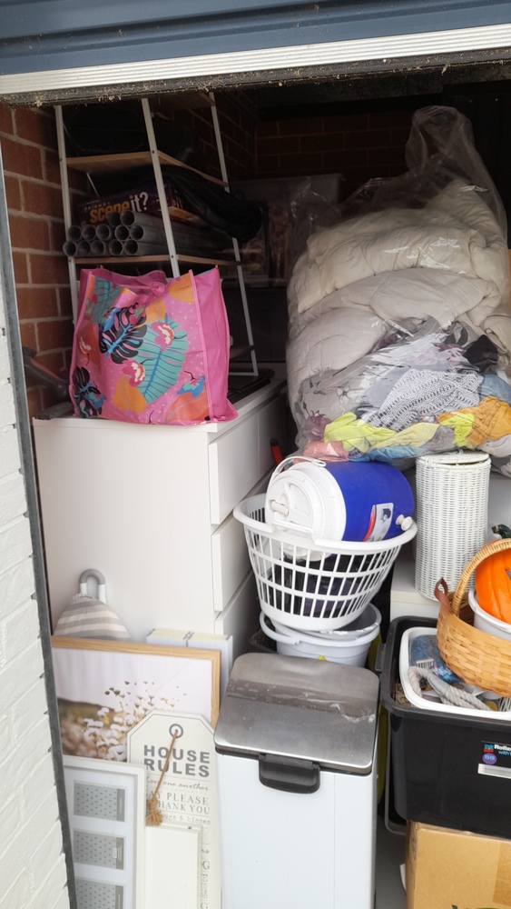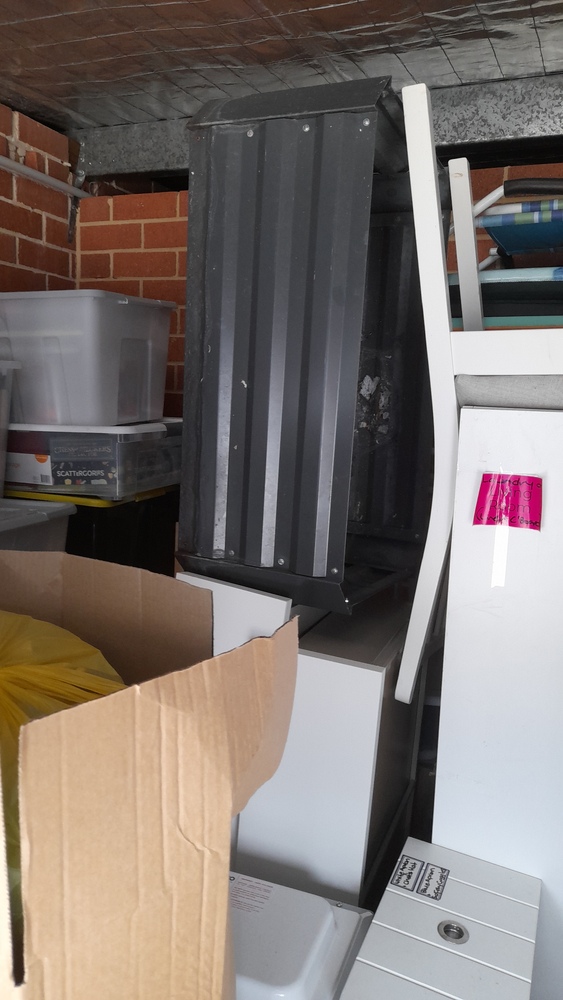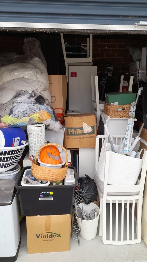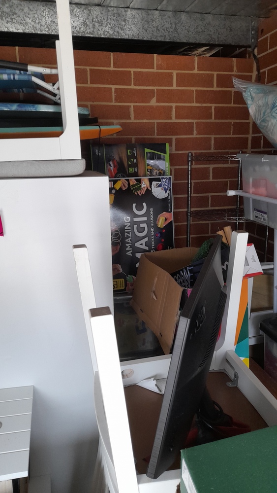 Tables and chairs, cupboard, chest drawers, boxes, garden bed frame,tiered chelving, tubs of misc, LG oled TV ,