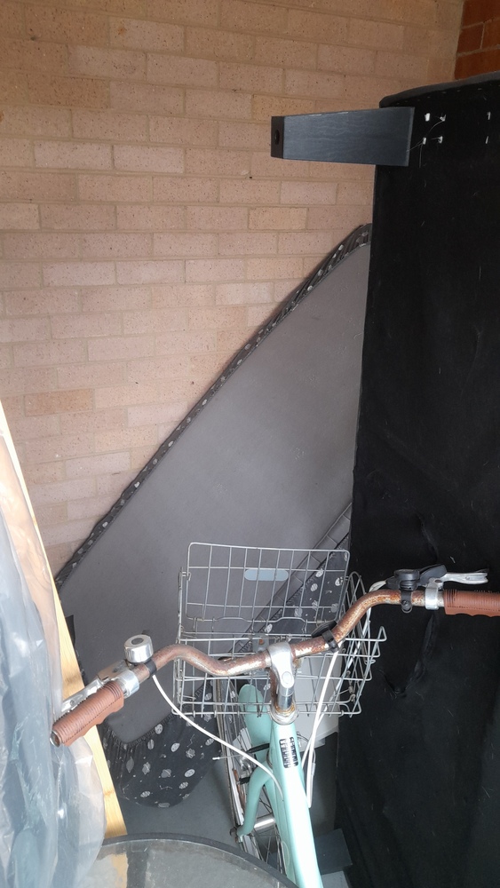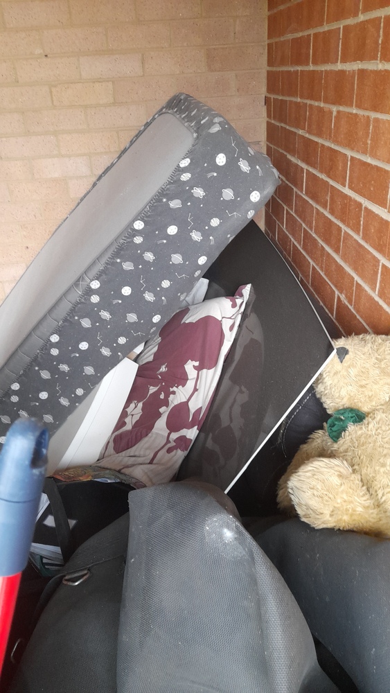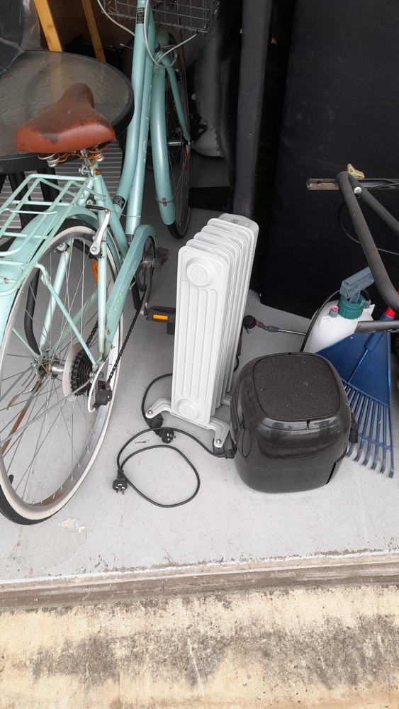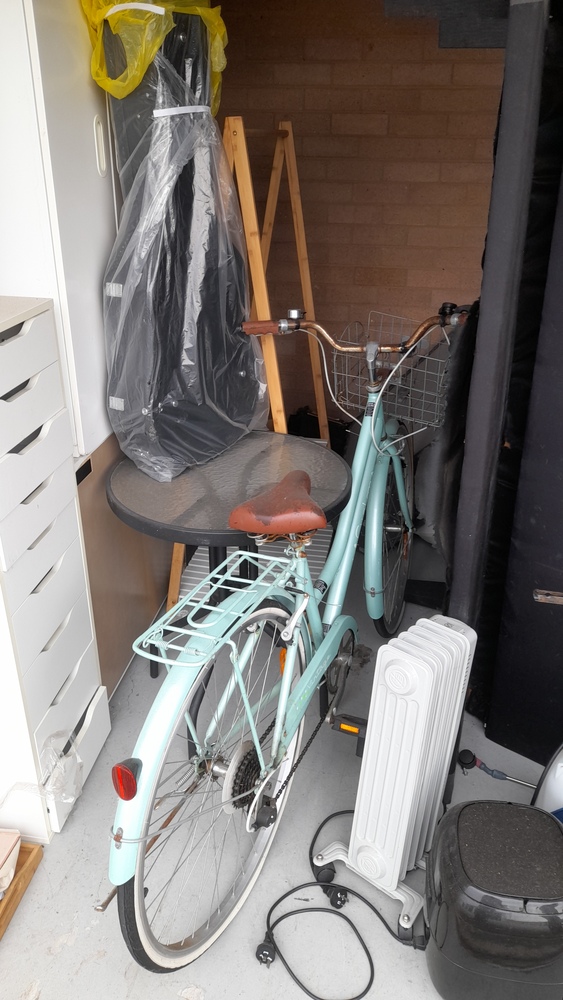 vintage bike, small outdoor setting, a futon, single mattress,mower,