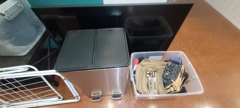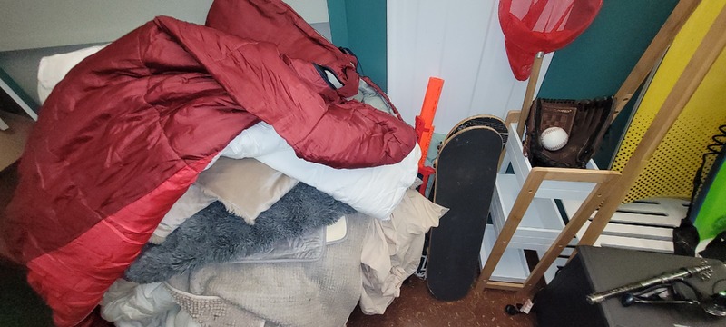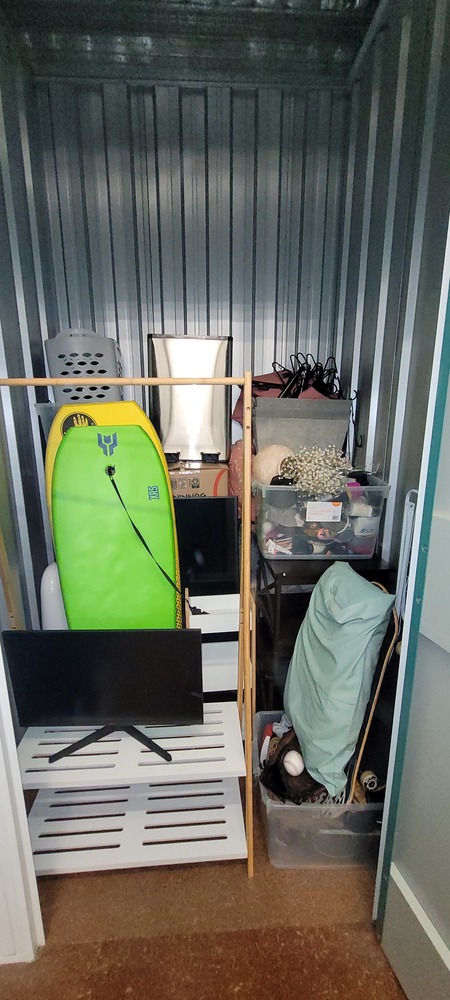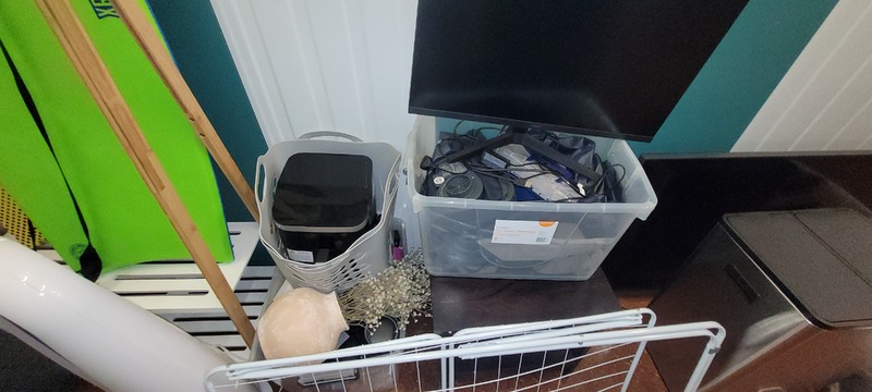 Baseball mitt x 2, Backpack, TV, Bin, Clothes rack, Lamp table x 2, Monitor, Tackle box, Air mattress, Air fryer, Assorted household items, Heater x 2, Body board x 2, Fishing rod, Shelf unit, Timber stand, Butterfly net, Skateboard x 2, Toy gun, Assorted manchester, Assorted picture frames and Assorted boxes of clothing & shoes.