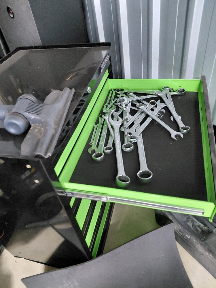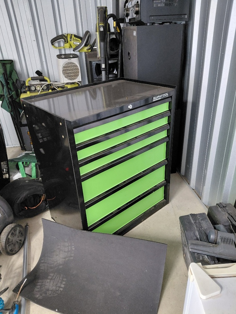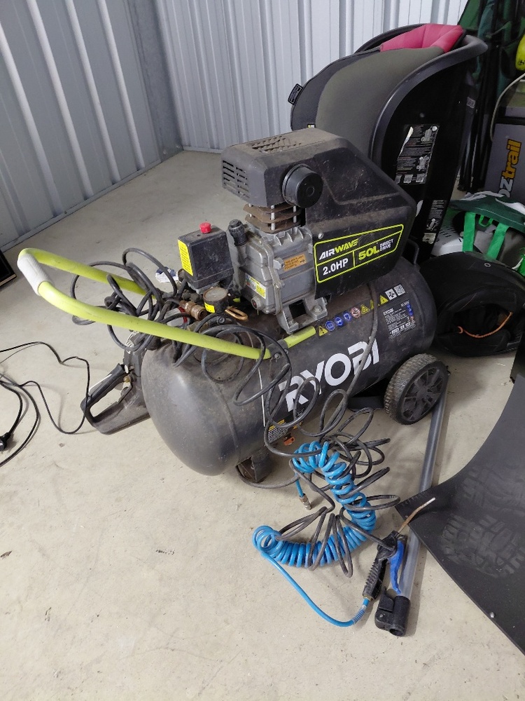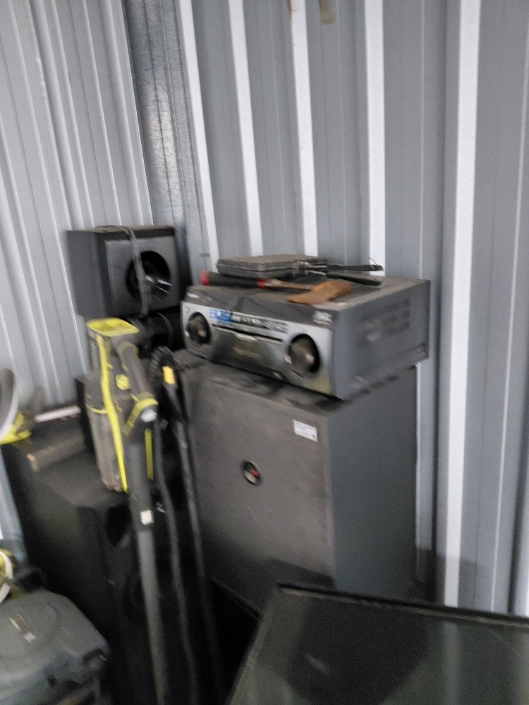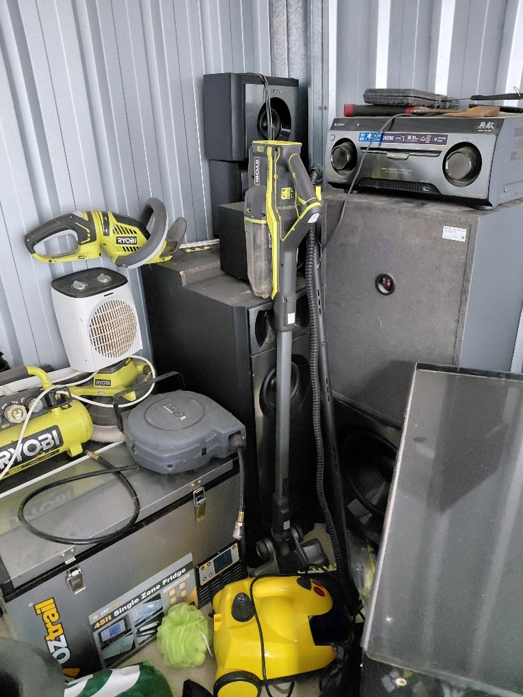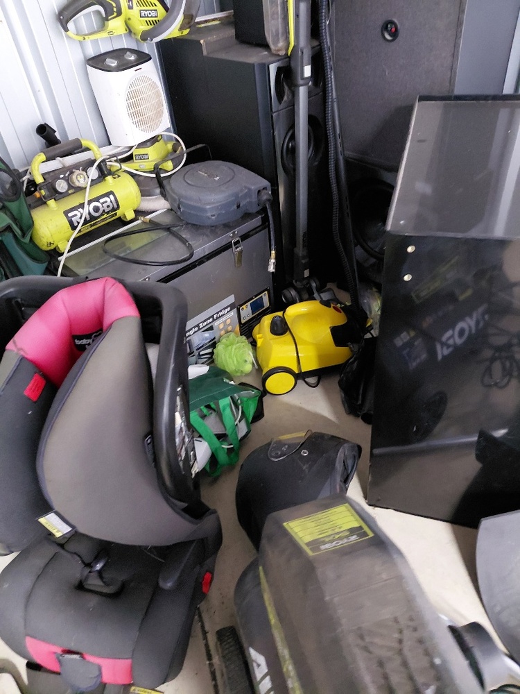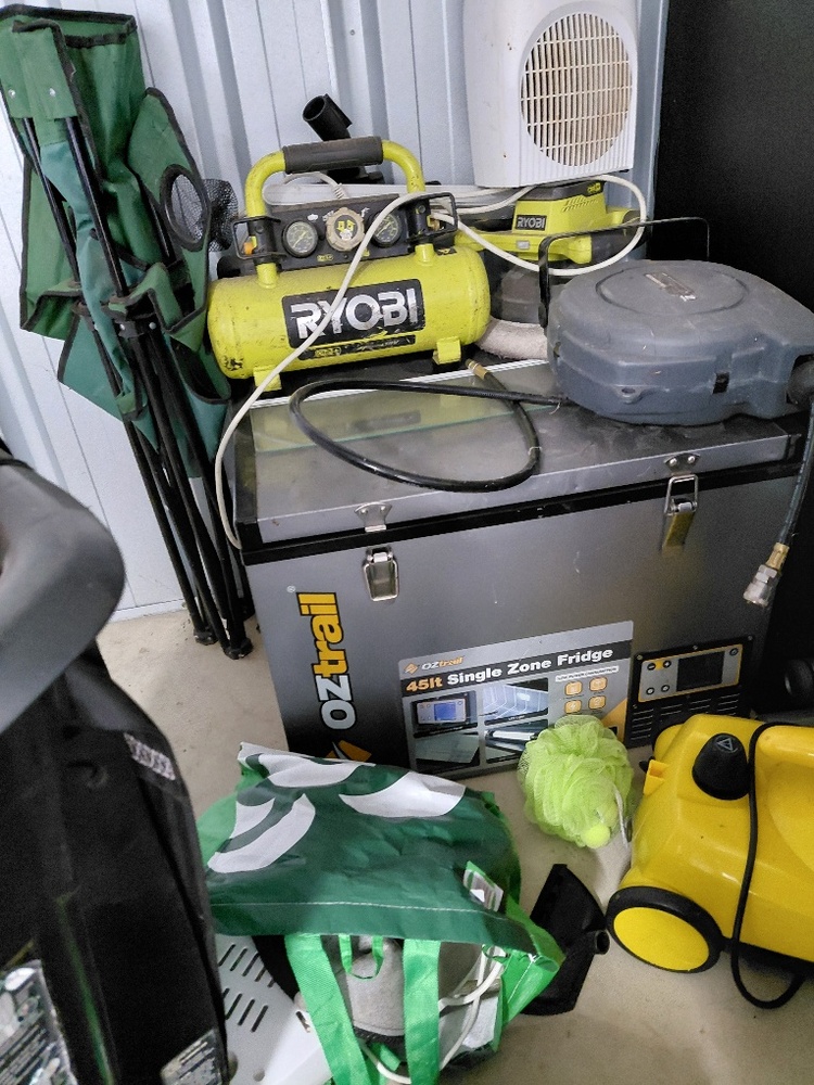 bar fridge, tool box, generators, camp chair, speaker tower, camp fride, ryobi vac, fan heater, TV, car seat, camp gas stove, ryobi sander, assorted ryobi power tools