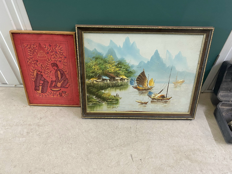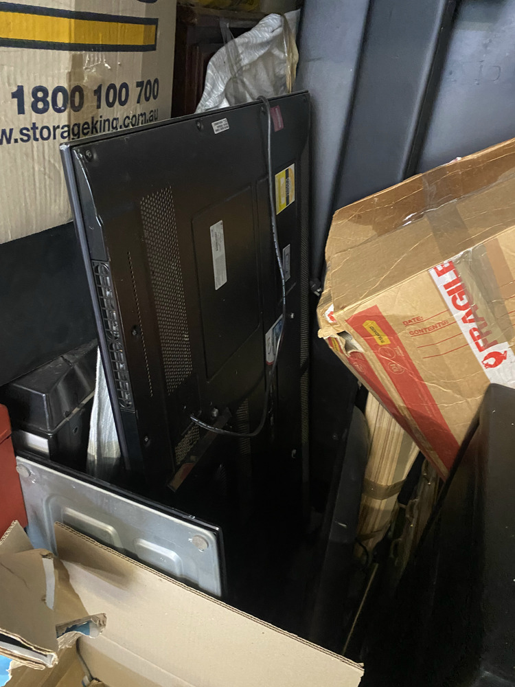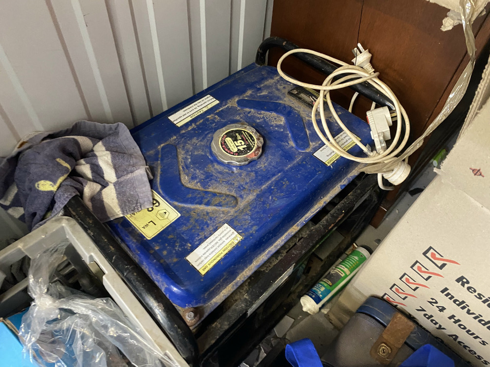 Generator, 2 Televisions, 3 Rolls of Cabling, Tool Chest with random tools / parts, Step for ladder, Glass Bowls, Air fryer, Vinyl covered drawers, Bed Frame, Assorted Boxes of Clothing and Household items, Hard Hat, Wire rope ratchet, Damaged Laptop, Stuffed Toy, Power Leads, Bag, Containers of random parts/items, 2 Small Suitcases, 2 Artworks, Ryobi Grinder, Ozito Planner, Watch, Coin