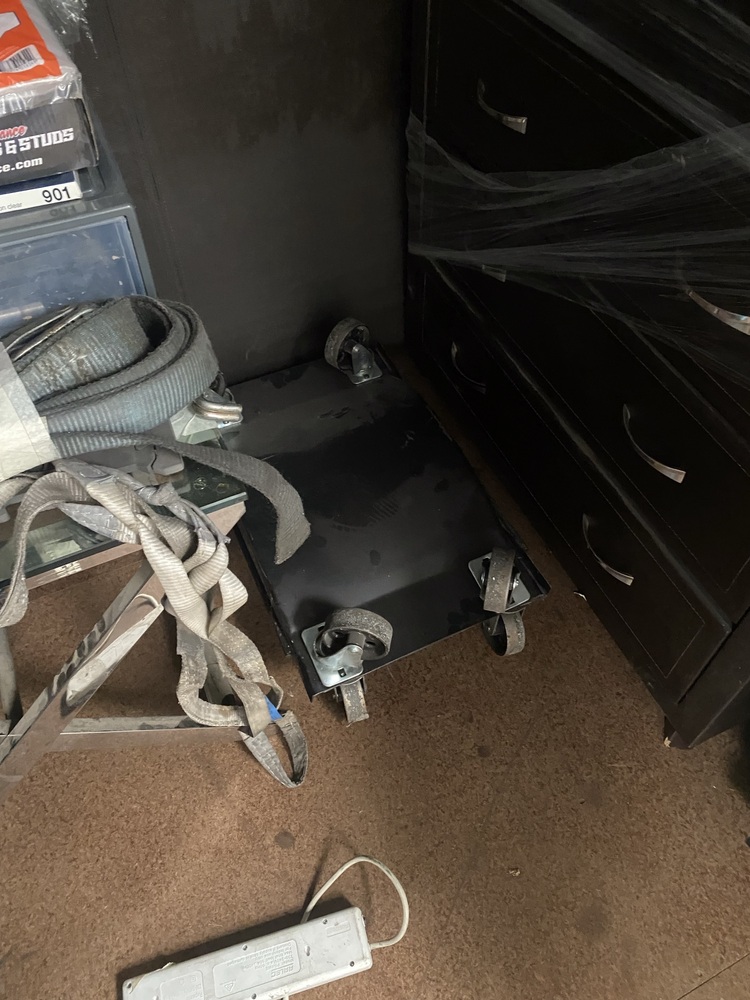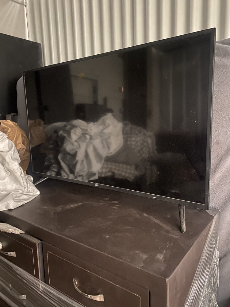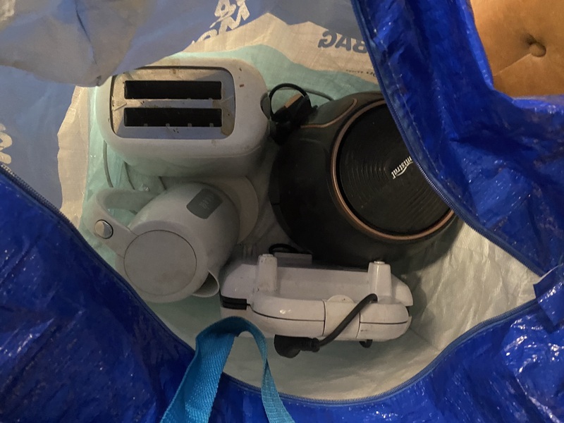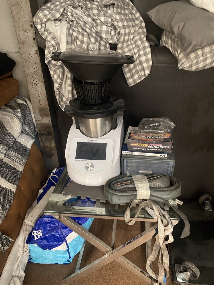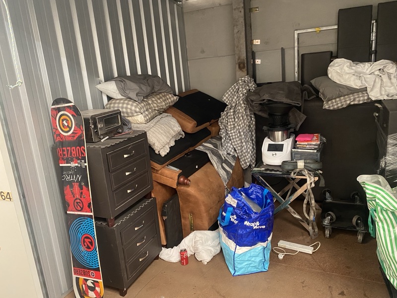 Fridge -- Chest of draws -- Large TV -- 2 BEDSIDE TABLES -- Couch -- Thermo Cooker -- Pillows -- Dinner set -- Air Fryer -- Kettle -- Sandwich Press -- Snow Board -- Bed -- TV dinner tray -- Camper oven -- LG Microwave -- Furniture Trolleys -- Bag of Clothes -- Small selection of tools
