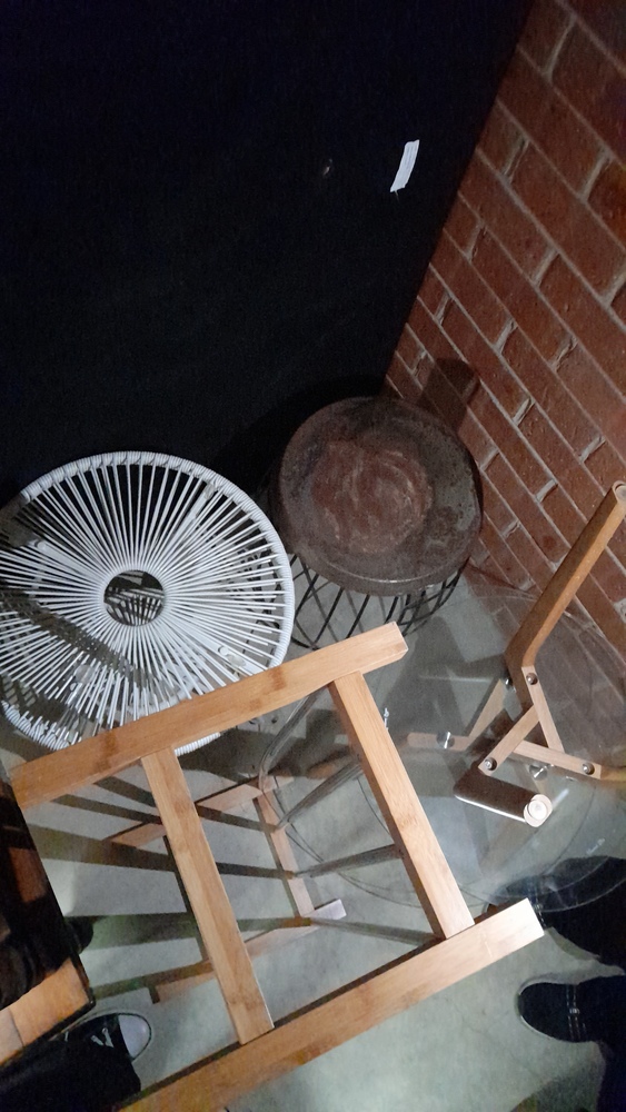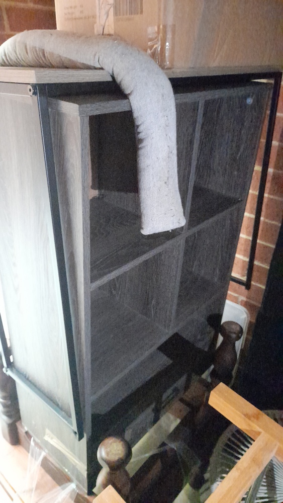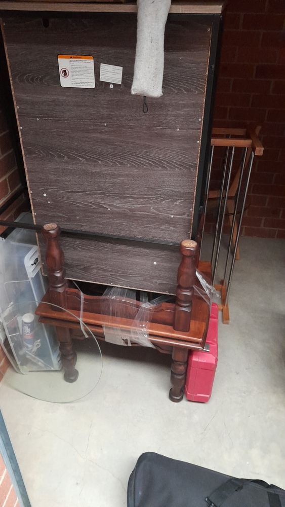 bow and arrow, coffee table, folding chairs, misc tubs, futon, shoe rack, glass cofee table, bookcase, boxes of misc, empty watch boxes, air pillow, books, axe