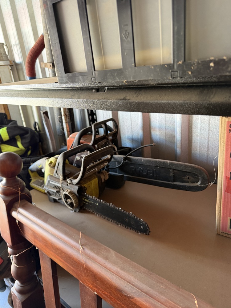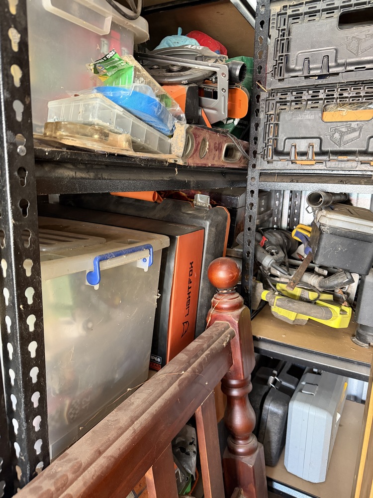 Storage space contains various power tools, shelving, queen bed, chest of drawers and toolboxes