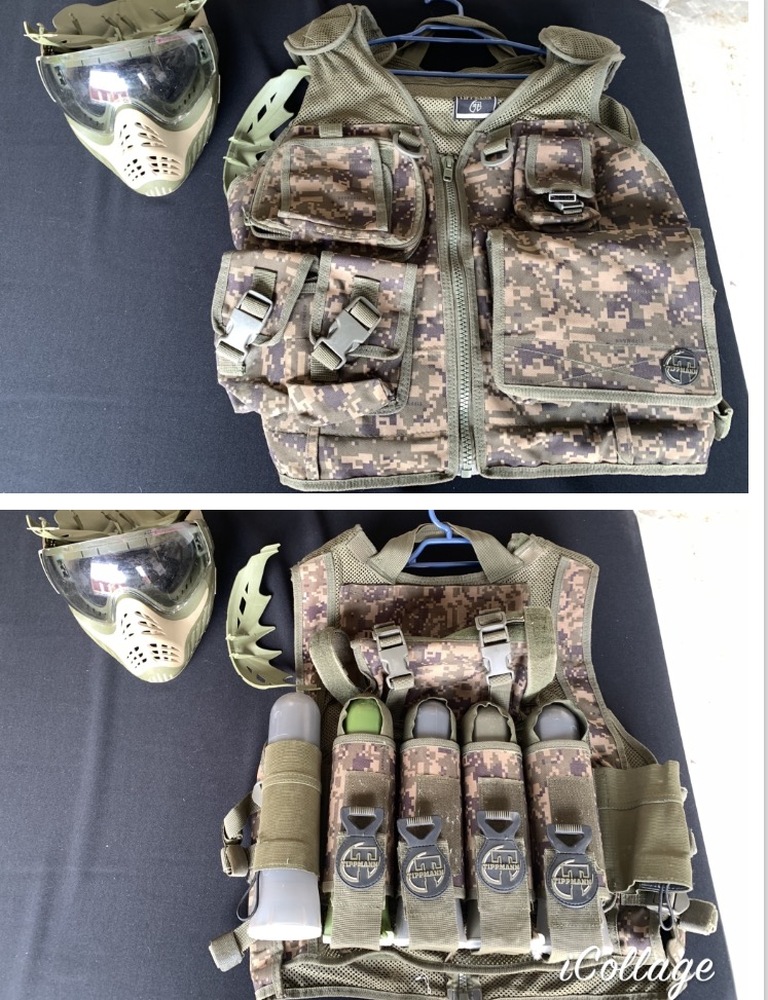 • Digital Camo Tippman paintball vest and 5 canisters.