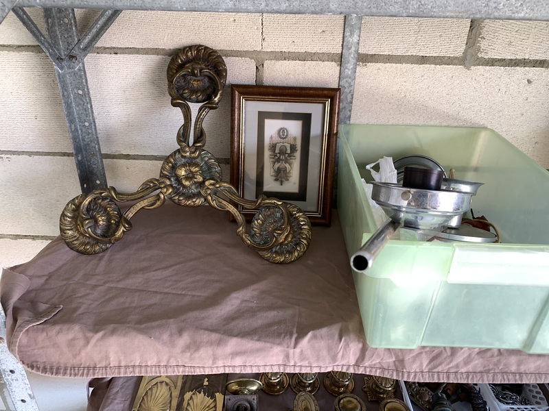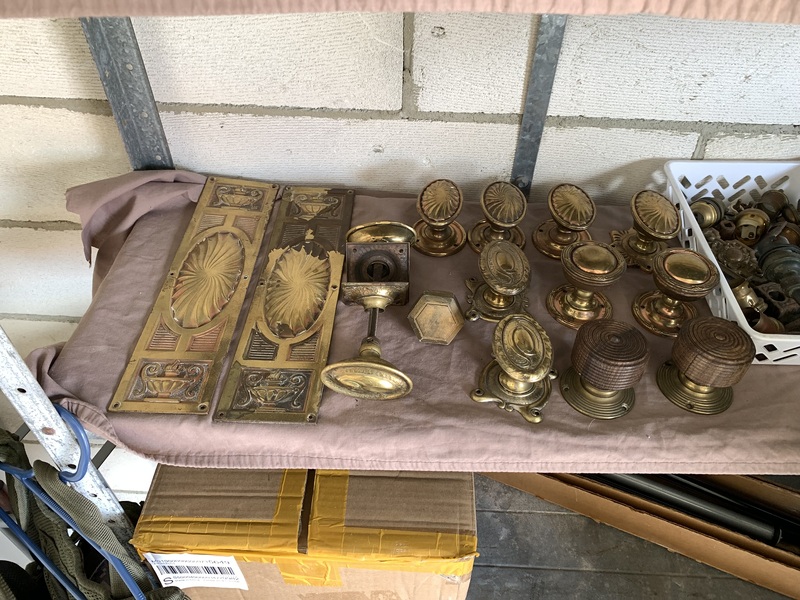• Multiple antique/vintage brass and wood door handles, locks, light fittings and other pieces.
