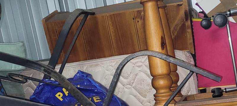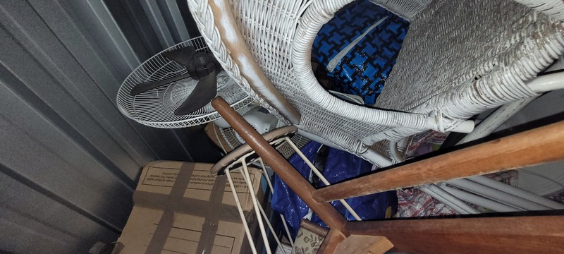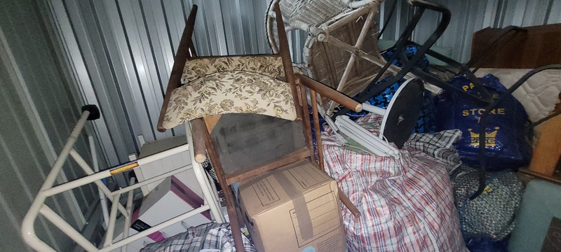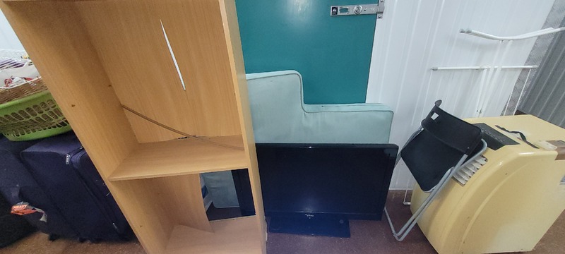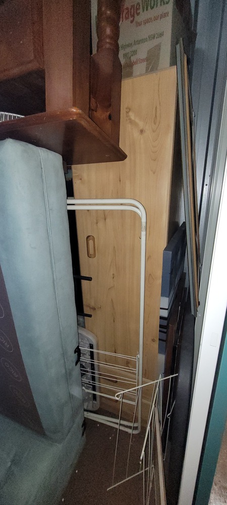 Portable Air con, Clothes rack x 2, Folding chair, TV, Bookcase, Suitcase x 2, Washing basket x 2, Assorted clothing, Recliner chair, Dining table, Shelf unit, Outdoor chair x 2, Cane drawer unit x 2, Shoe rack, Metal frame, Microwave, Chamfer chest, Lounge, Wardrobe, Hall table, Footstool, Side table, Assorted wall art, Outdoor table, Trestle table, Filing cabinet, Dining chair x 2, Cane chair, Fan, Bedside x 2, Assorted unopened bags & Boxes, Mattress & Base, CD tower x 2, Metal stand, Washing machine & Assorted household items.