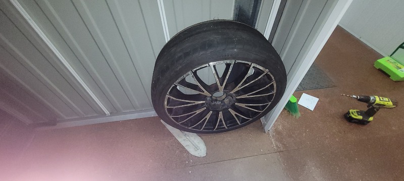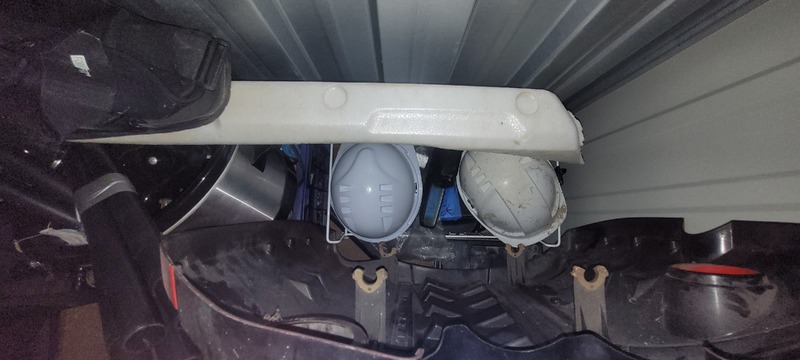 Rim & tire, Square, Trowel, Matts, Engine cover, Hard hat x 2, Slow cooker, Swag, Speaker x 6, Milk crate, Foot stool & Plastic stand.