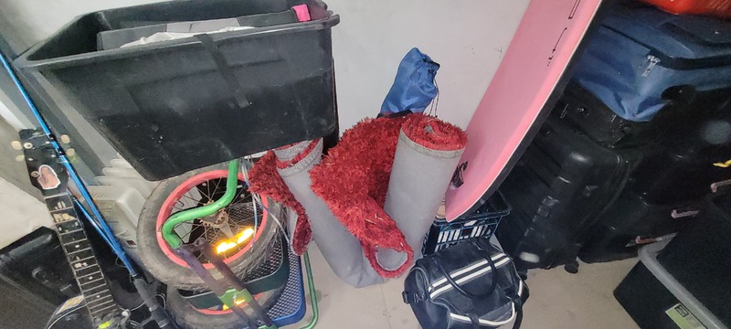 Blower, Guitar, Fishing rod, Oil heater, Rug, Folding chair, Body board, Suitcase x 7, Assorted Bicycle tires & rims, Tackle box, Sewing machine, Travel suitcase, Assorted household items, Assorted art & craft supplies, Assorted clothing, Assorted crockery, Picnic basket, Assorted manchester & Assorted unopened plastic containers.