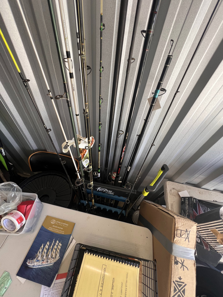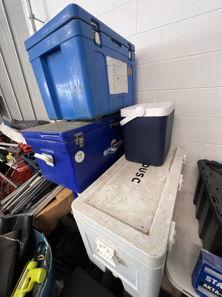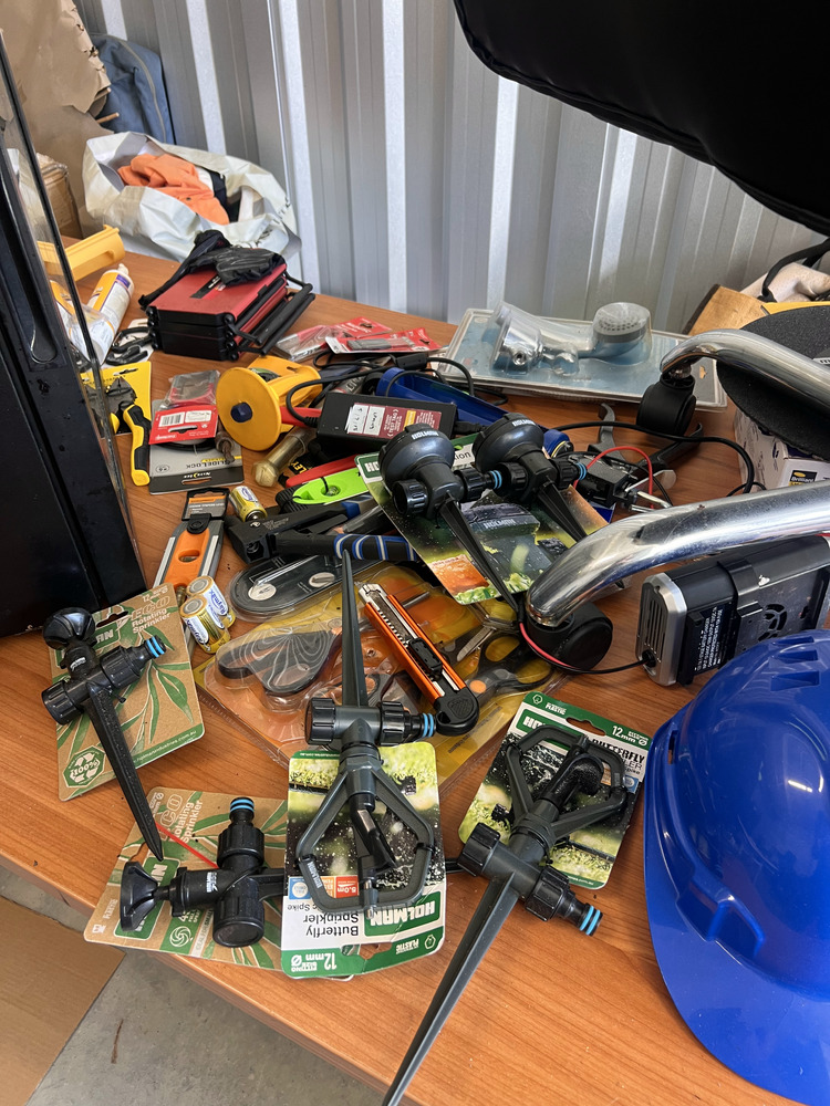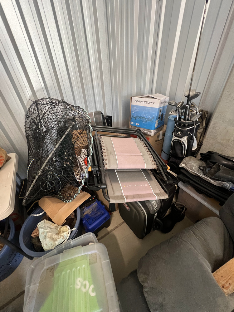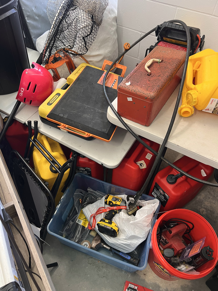 Multiple fishing rods, household furniture, spare wheel, jerry cans, camping equipment, portable upholstery cleaner, multiple eskies, multiple bulk lift bags, assorted shed equipment, multiple gardening tools, large box of bolts, assorted small hand tools, office chair, workwear, bar fridge, fishing gear, Milwaukee tough shell heat jacket, jet ski jackets, office furniture, snowboard bag, pet potty mat, grey suede lounge chair, some household furniture, golf clubs, men's work boots, flippers, kitchenware, electric portable fridge, power cooker, and stock pot set, tent, stretcher bed, power inverter times two, portable hand electric tools, rock and soil samples, bike rack, fold-out outdoor tables, portable shower set, tent, multiple eskies, multiple industrial containers, barbecue, chainsaw, paddle for kayak, gumboots, two electric mowers, one hand push mower, satellite phone plus case, toolboxes, assorted tools, multiple gas bottles, pedestal fan, hydrochloric acid, drop saw, camp chair, pro-rack roof racks, Electric-powered gardening tools, soundbar, workhorses, cool cabana, electric extension cord, Everfit brand fitness machine, queen bed mattress, poor condition, trestle, tables fishing nets, socket set, portable battery.