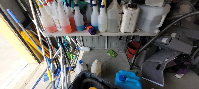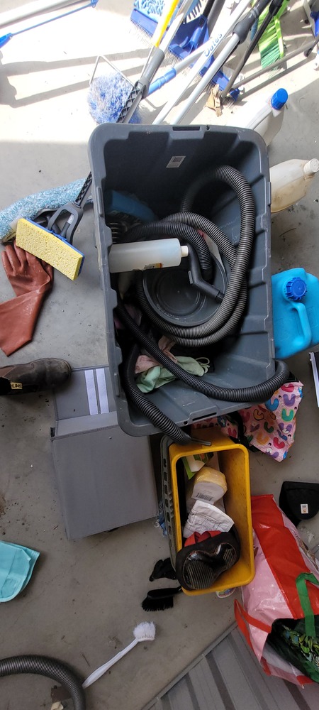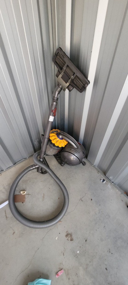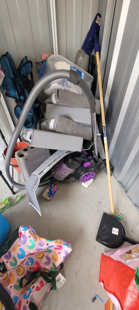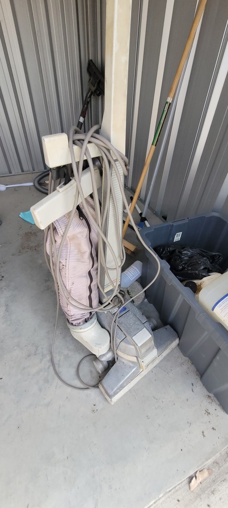 Assorted cleaning equipment, Trestle table, Assorted cleaning supplies, Dyson Vacuum x 2, Kirby Vacuum, collapsable filing folders, Assorted drums, Assorted plastic trays & Plastic tub x 2.
