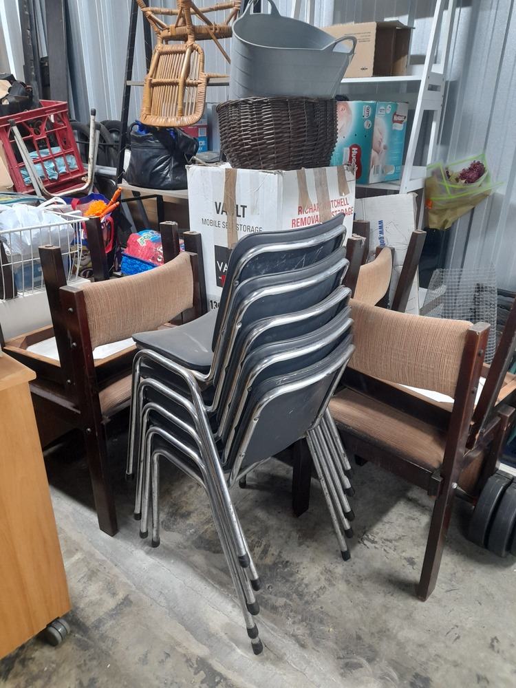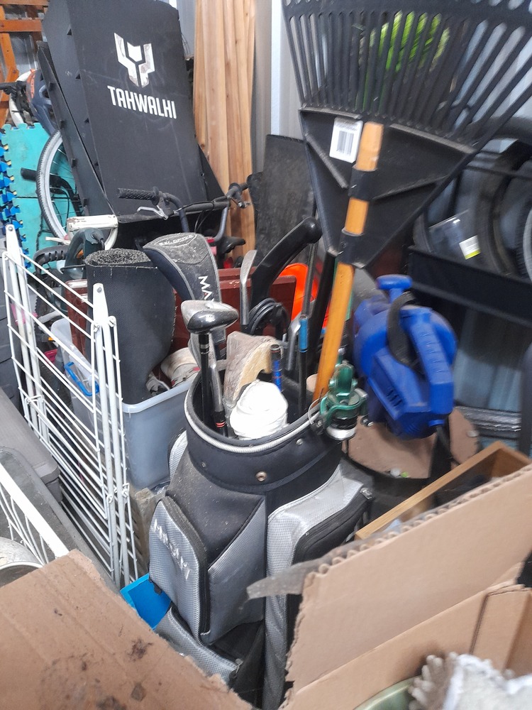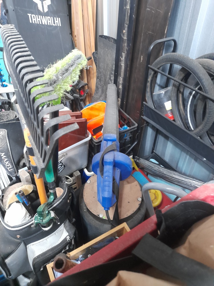6x dining chairs, 5 x padded vinyl chairs, 4 x outdoor chairs, garden equipment- hose & hose reel, blower vac, whipper snipper, shovel. Dolley trolley, fireplace accessory stand, 2 x display shelves, GMC circular saw, other assorted tools, weight bar and weights, glass outdoor table, computer table, PC computer, unknown size- bed frame. 2 x bikes, wicker furniture, wooden tall boy, 2 x skate ramp, bike tyres, filing cabinet, step ladder, computer chair, kids' stuff and loads of unopened boxes.