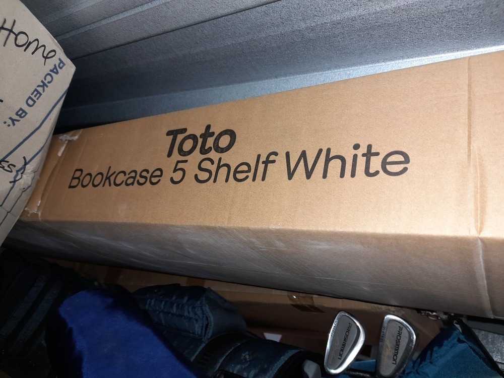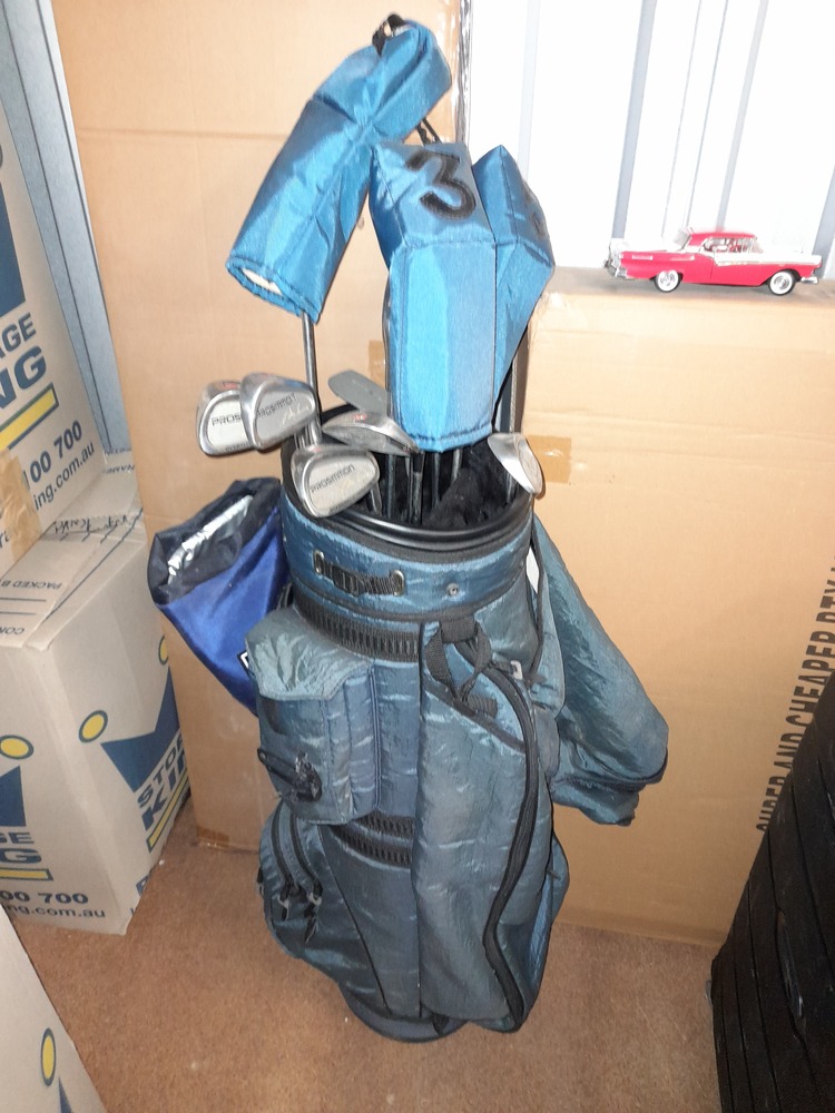 5 shelf bookcase and a set of Prosimmon golf clubs in bag.