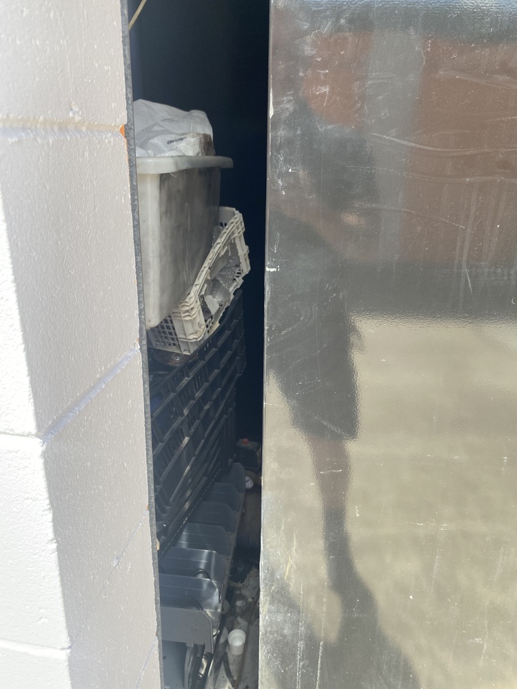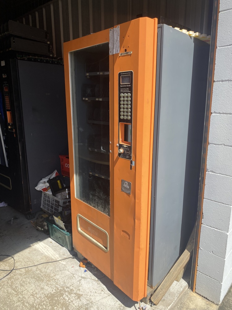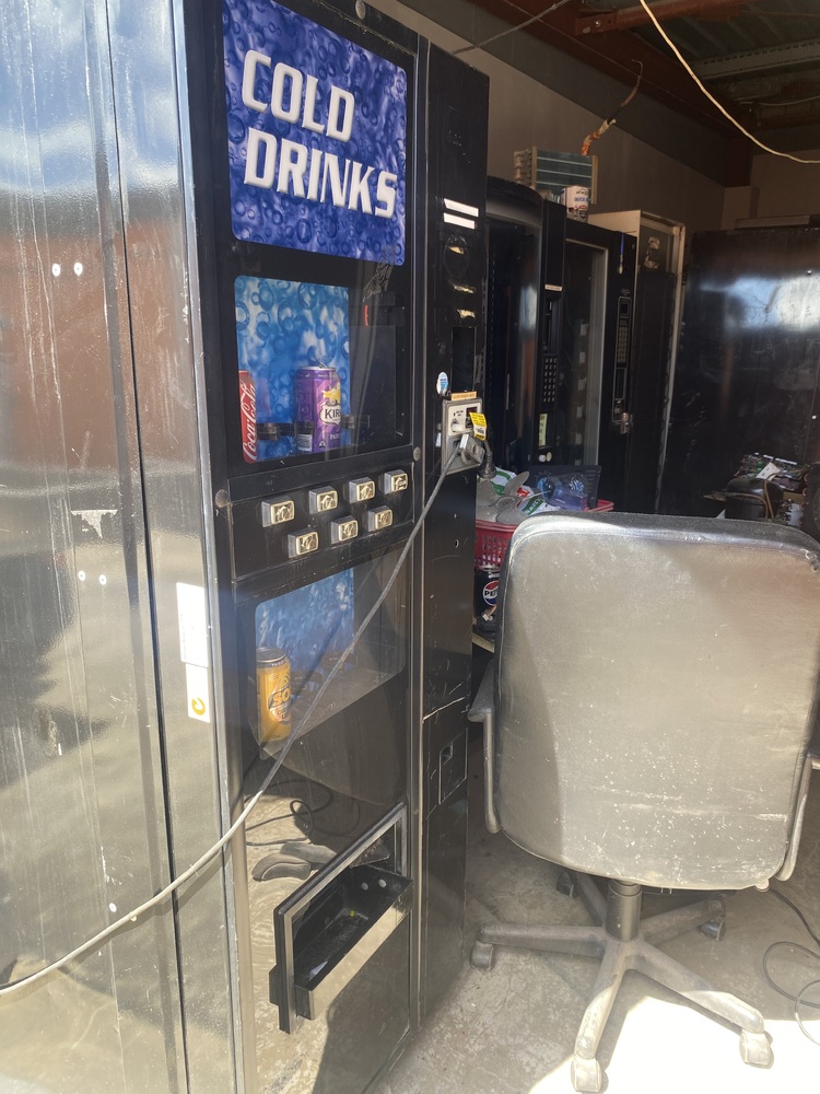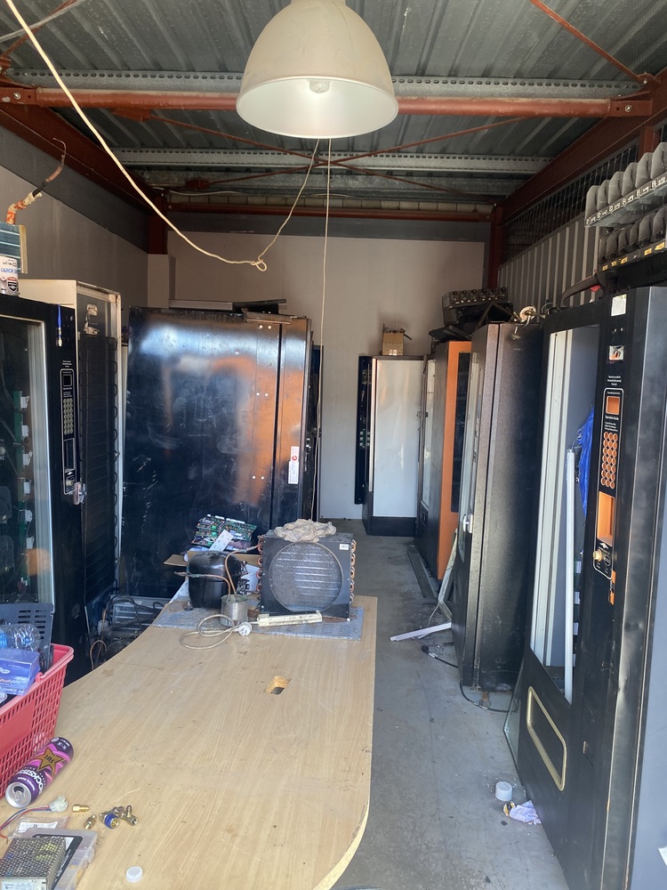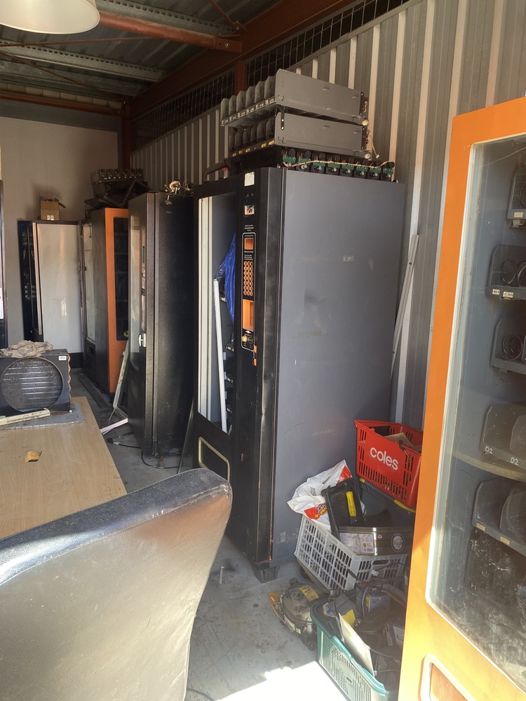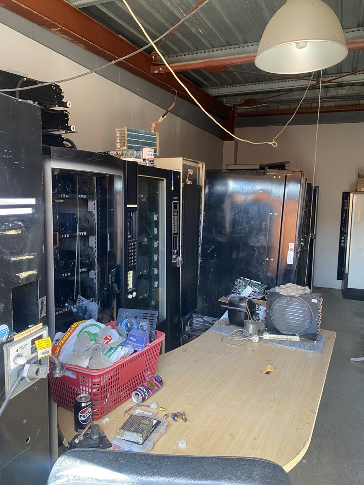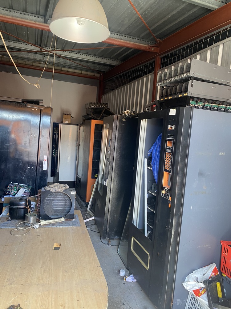 Air compressor, two fridges, 14 vending machines, desk, office chair.