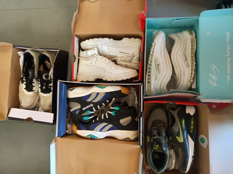 Various Shoes - Phantom Footy boots x 2, Dress shoes x 3, Nike air max x 5, Nike Faluwanc x 2, Reebok trainers, Nike Ultraboost x 2, Sketchers joggers, various bags of other shoes