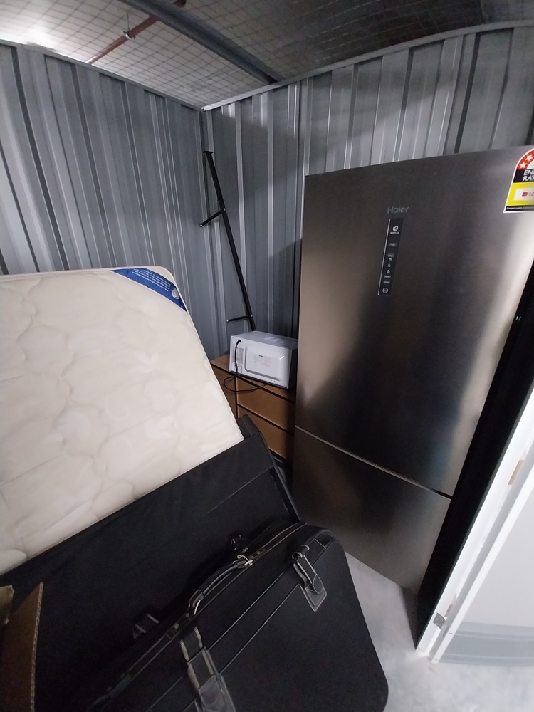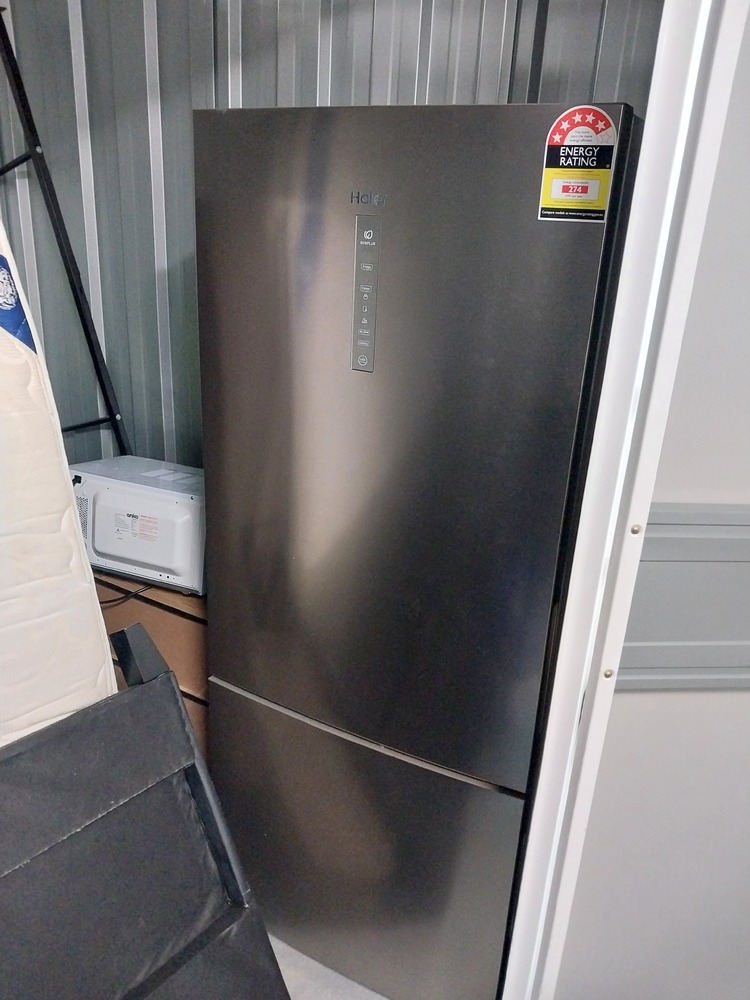 Near new Fridge. 2 mattresses and bedframe. Microwave, 2 misc boxes and chair