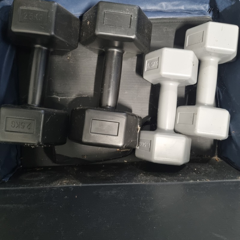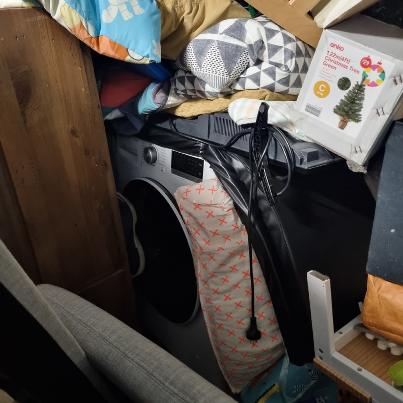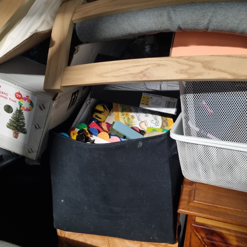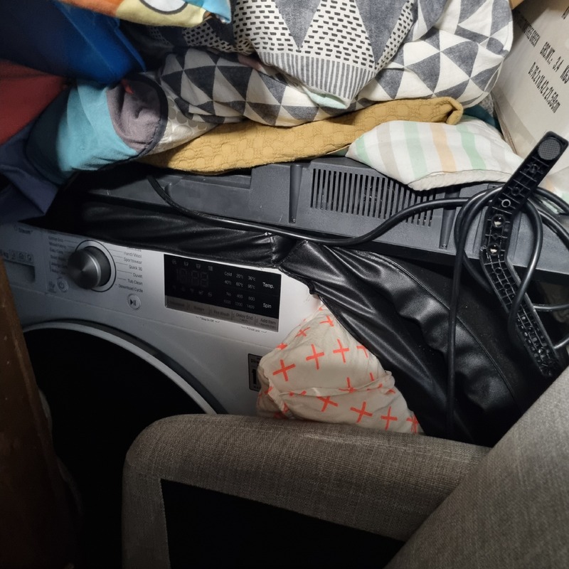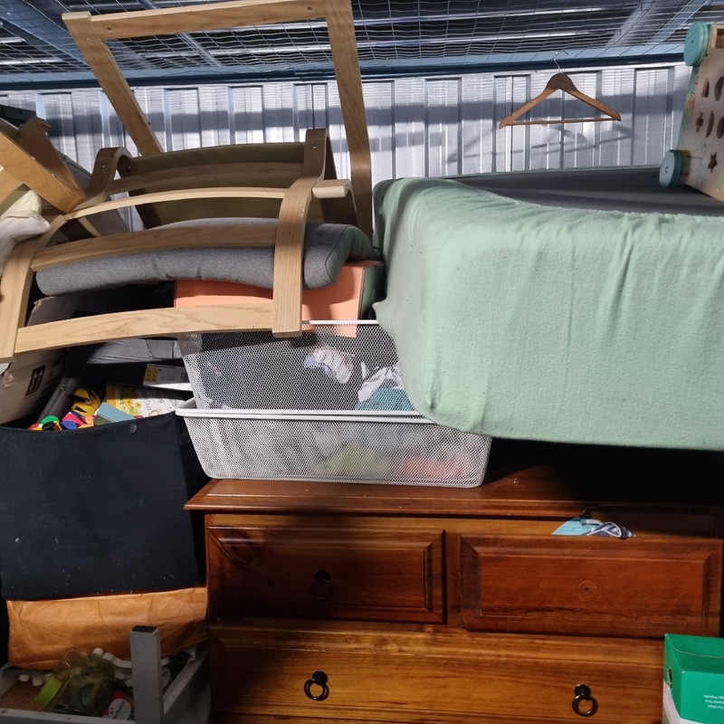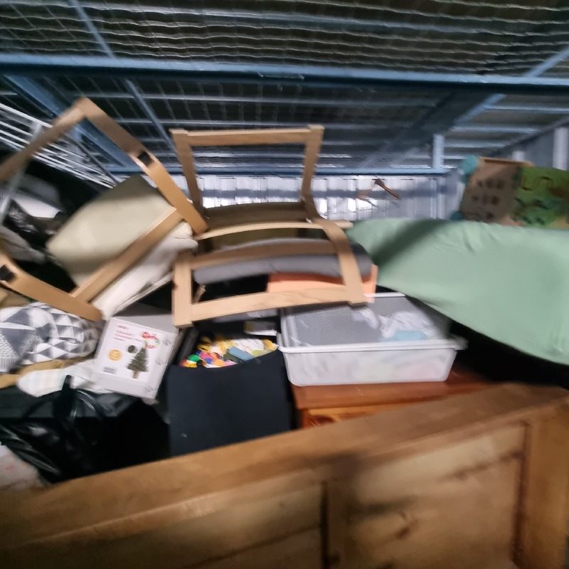 Queen bed & mattress / Dumb bell set / Weber BBQ / portable camp fire / tallboy / washing machine / various children's toys / various clothing items / radiator heater / various bedding items / flat screen TV / single bed mattress / Dyson stick vaccuum