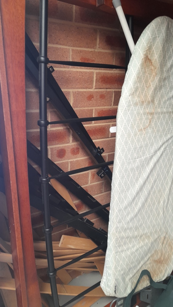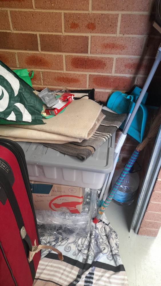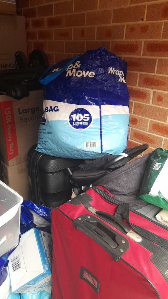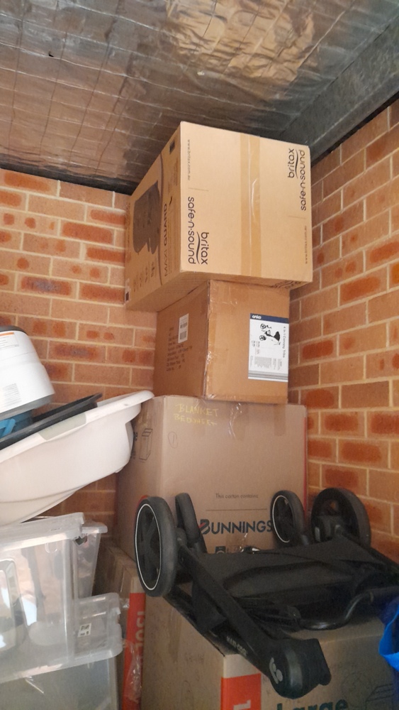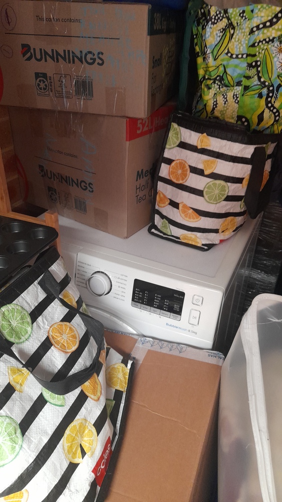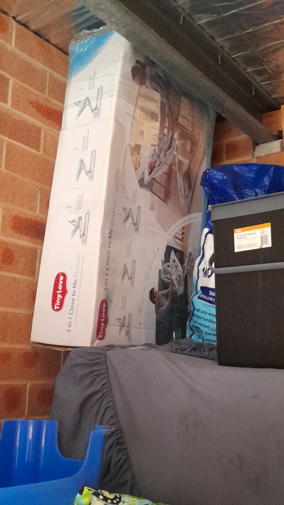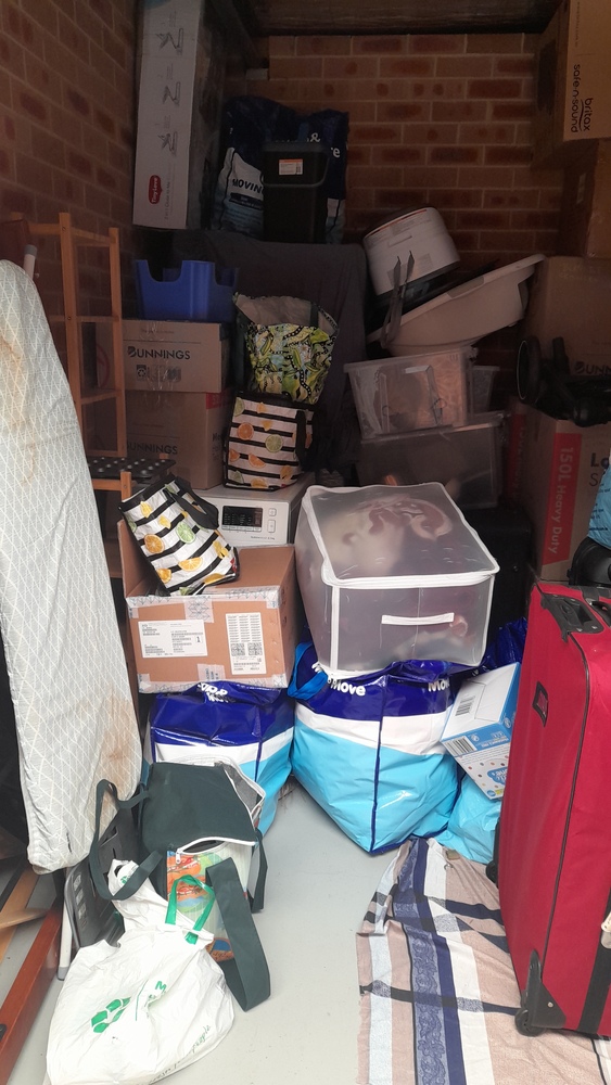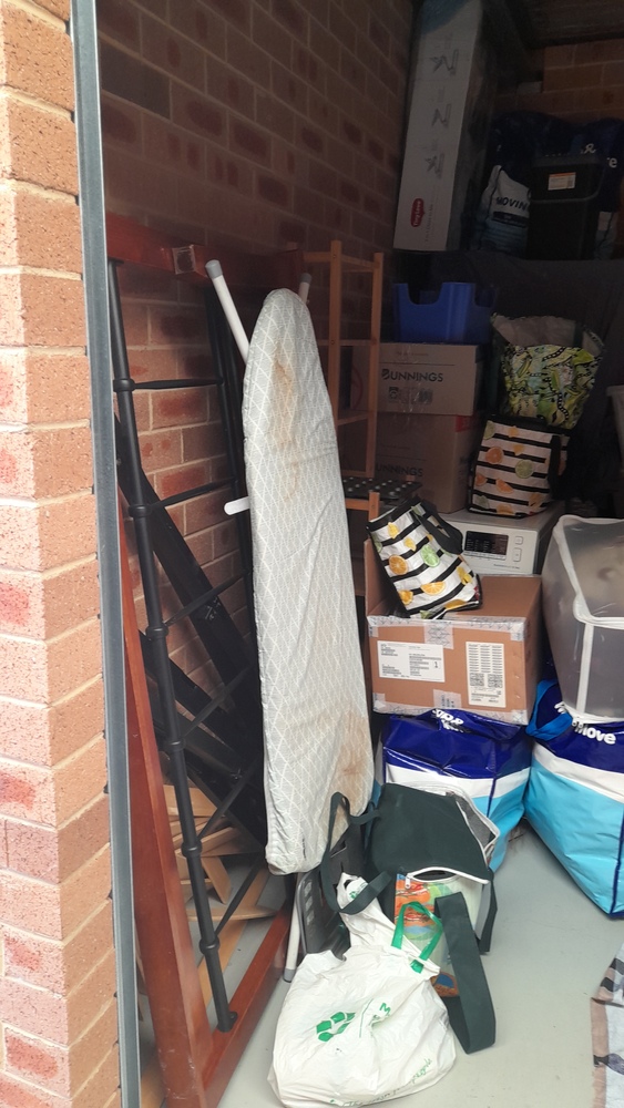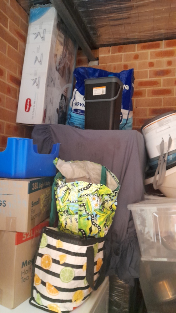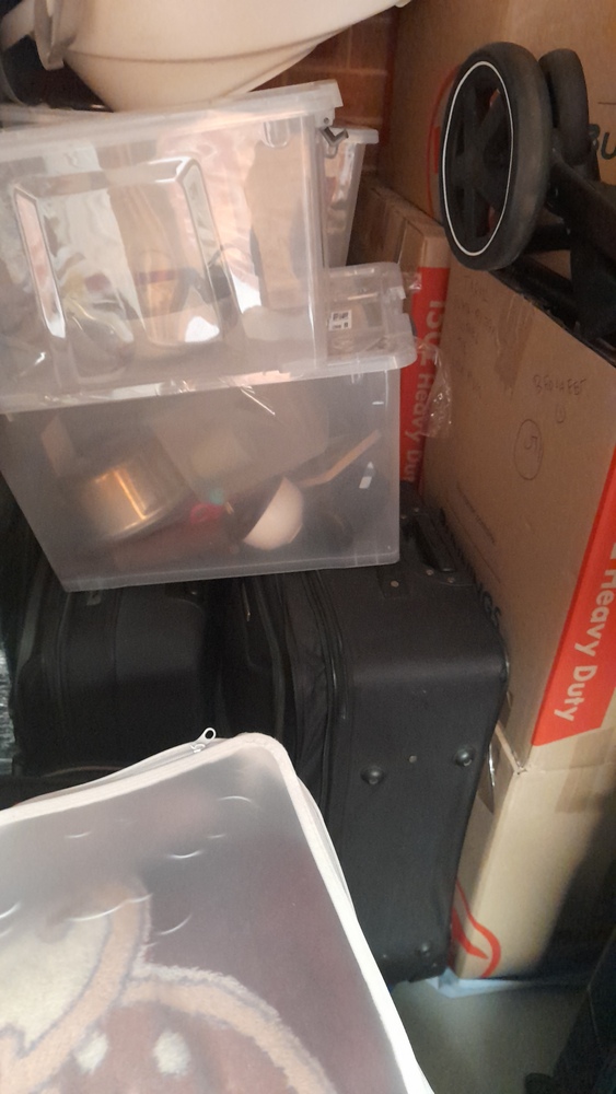 ironing board, bed frame, tubs & boxes,pram,baby bath, suitcases, baby bouncer,storage bags of clothes, washing machine, cabinet, blankets, kitchen pots and bowls.