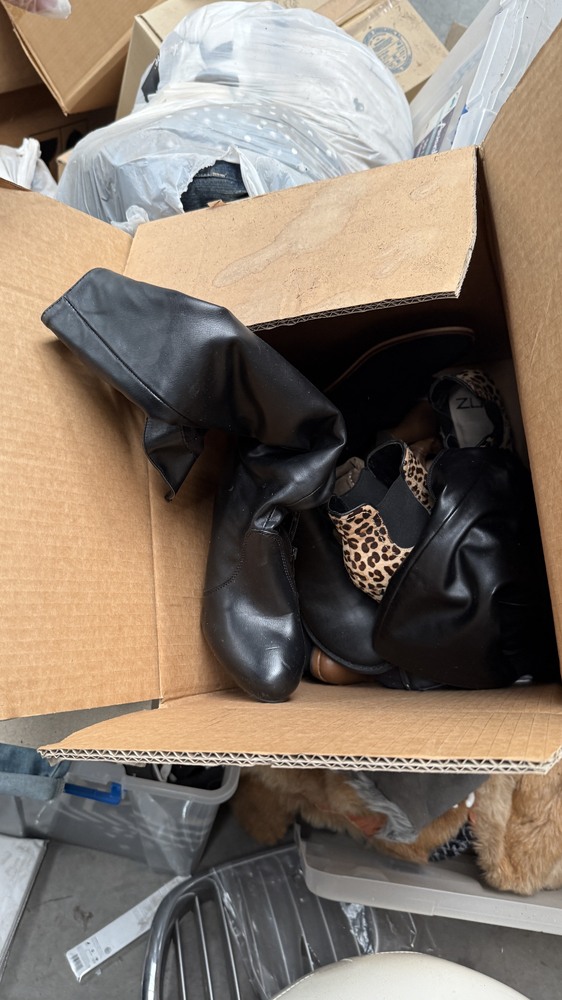 Multiple boxes and bags of used clothes.