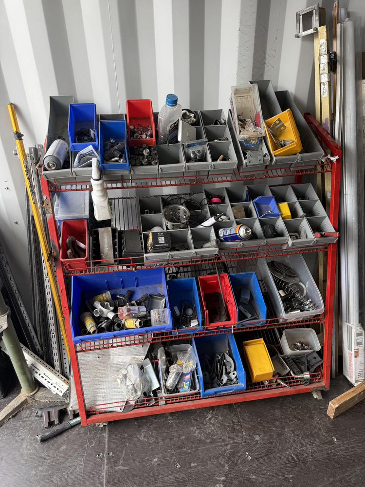 Heavy duty shelving unit with parts bins