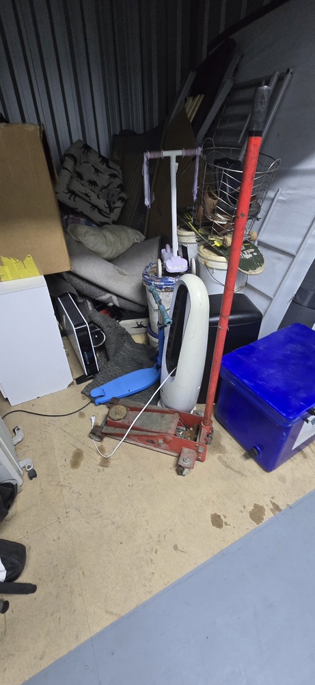 Heavy duty trolley car jack, oil heater, drawers, fridge/freezer, wake board, matters, bed frame, fishing rods, mop, esky with toys inside, and assorted items.