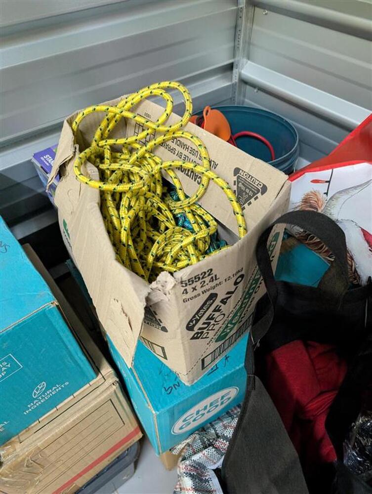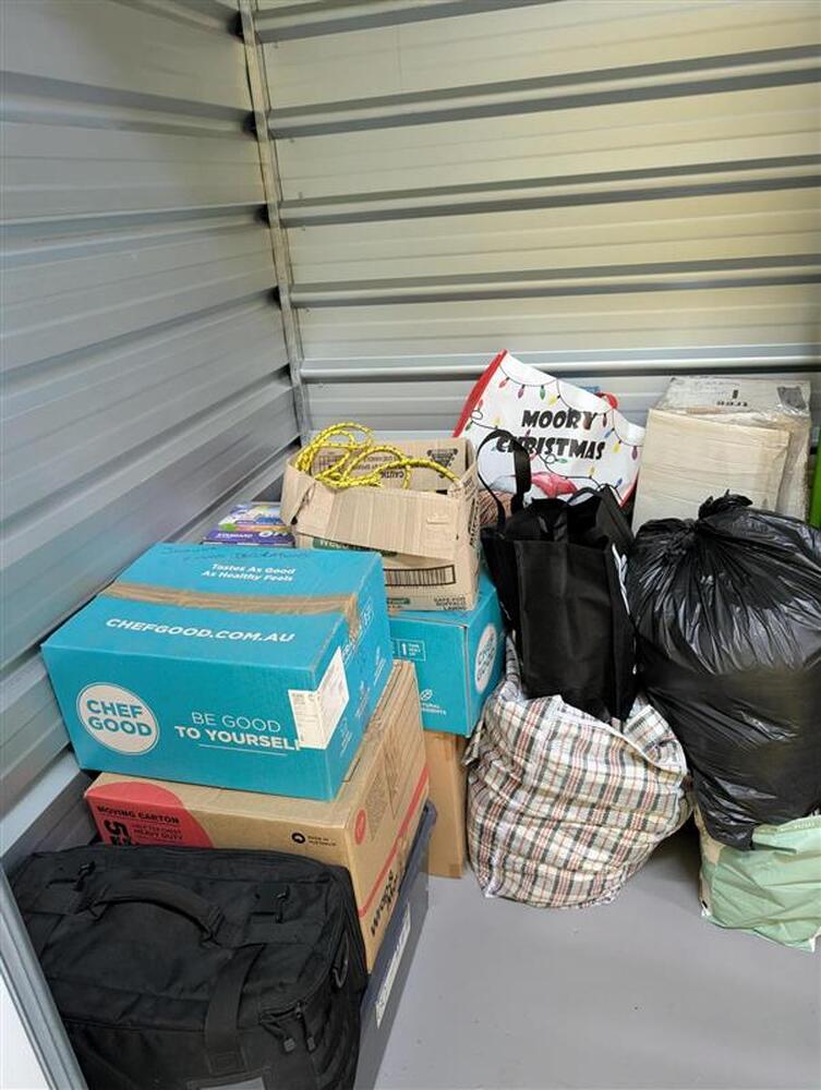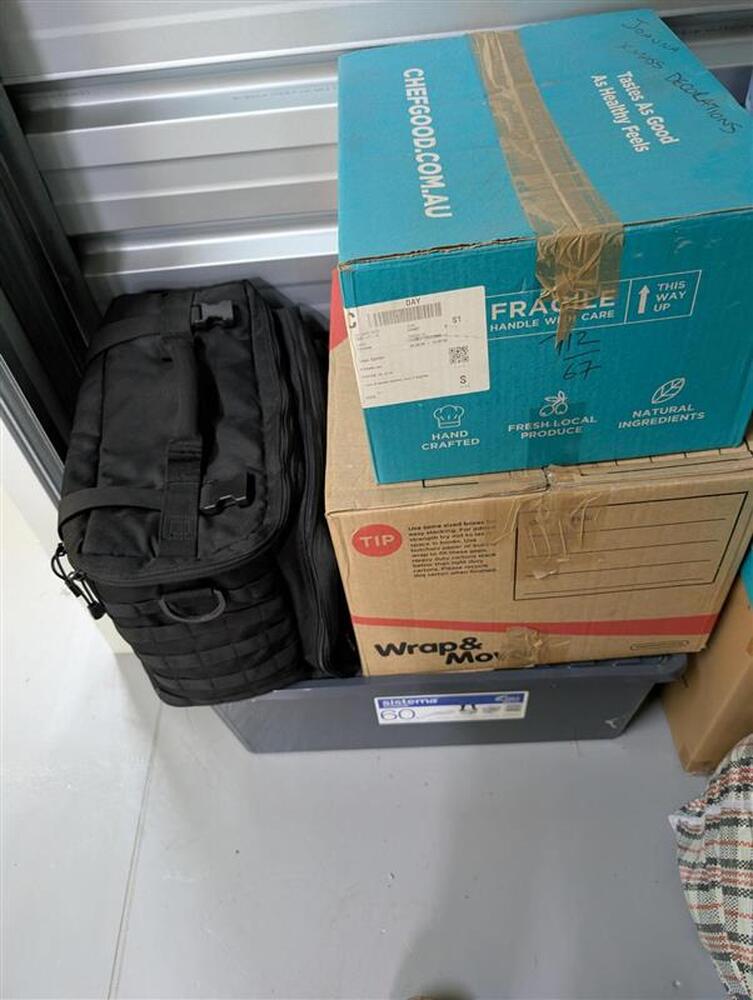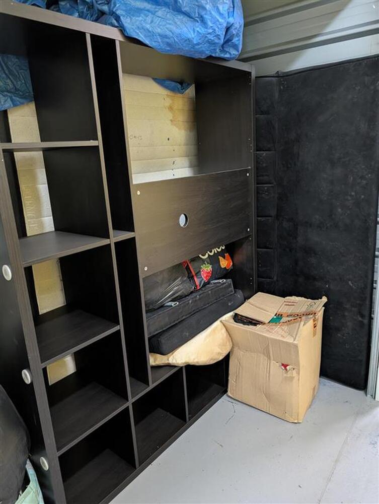 From what we can see inside this unit we have, an entertainment unit, a cargo cover, brand new sac truck, faux suede bedhead and lots of boxes/bags full of stuff. We could not see all the way in so who knows what else might be in this unit…