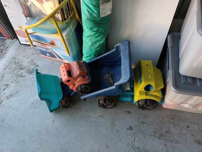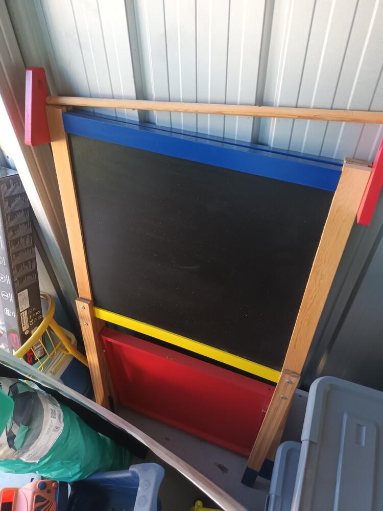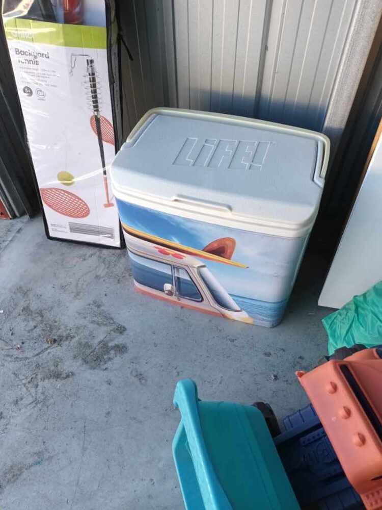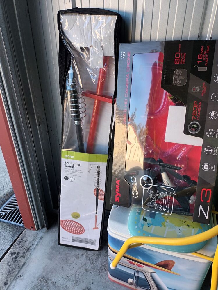 Drone, portable cooler, kid's chalkboard, beach shelter, backyard tennis set, plastic tubs
