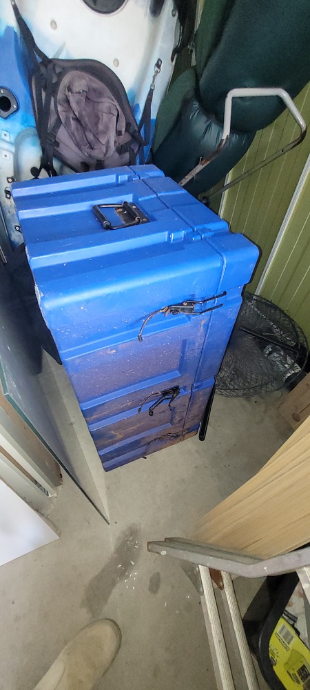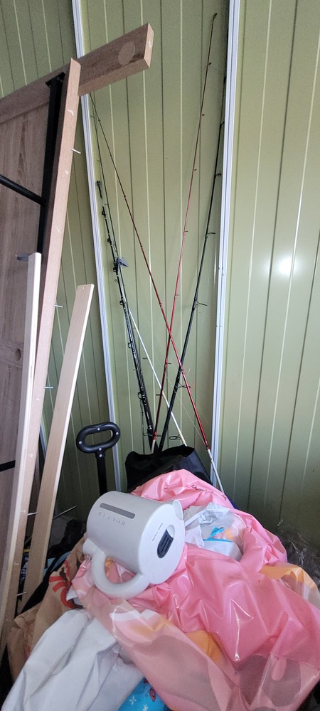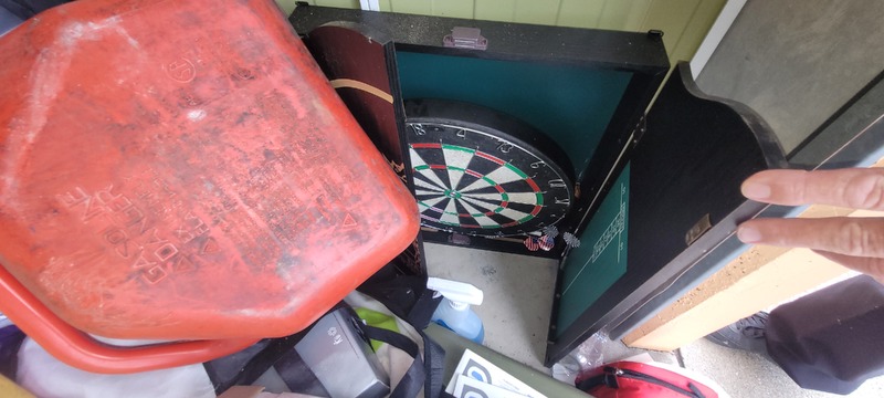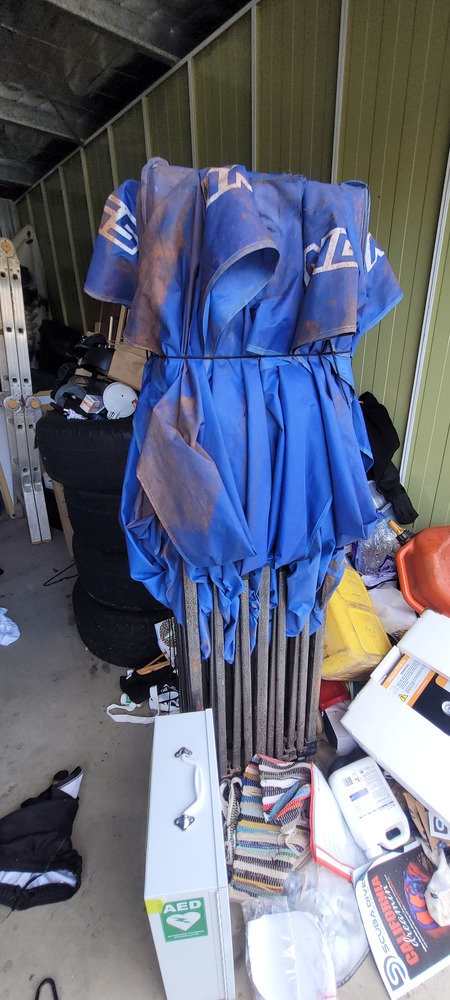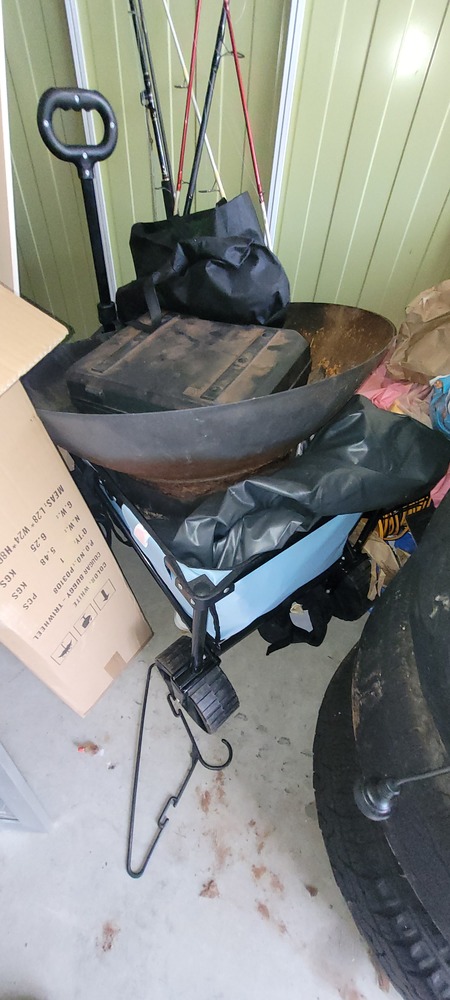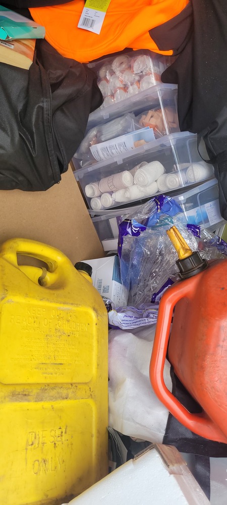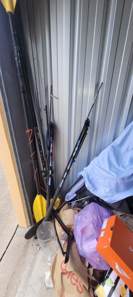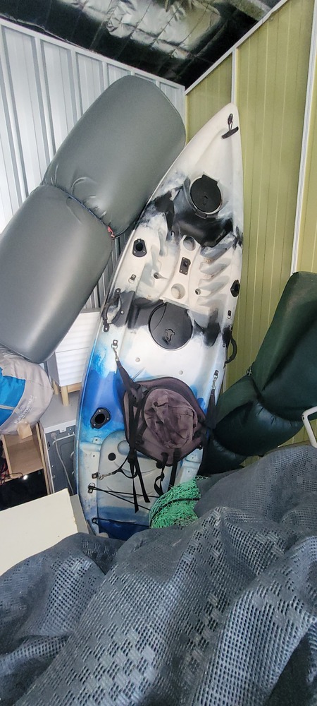 First aid box, Bakers Stone grill, Jerry cans x 3, Dart board, Assorted first aid supplies, Gazebo, Assorted spear guns, Assorted fishing rods, Paddles x 3, Assorted clothing, Assorted shoes, Rim/tyre x 4, Assorted kitchen items, Pull cart, Fire pit, Bed frame, Ladder, Movie wall art x 3, Ice box, Kayak x 3, Washing machine, Air mattress x 2, Tent, Assorted fishing nets, Lawn mower, Bedside, Bookcase unit, Drawer unit on wheels, Assorted household items & Hedger.