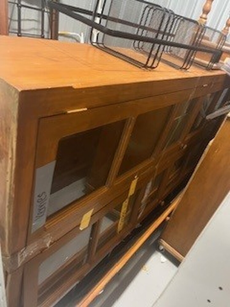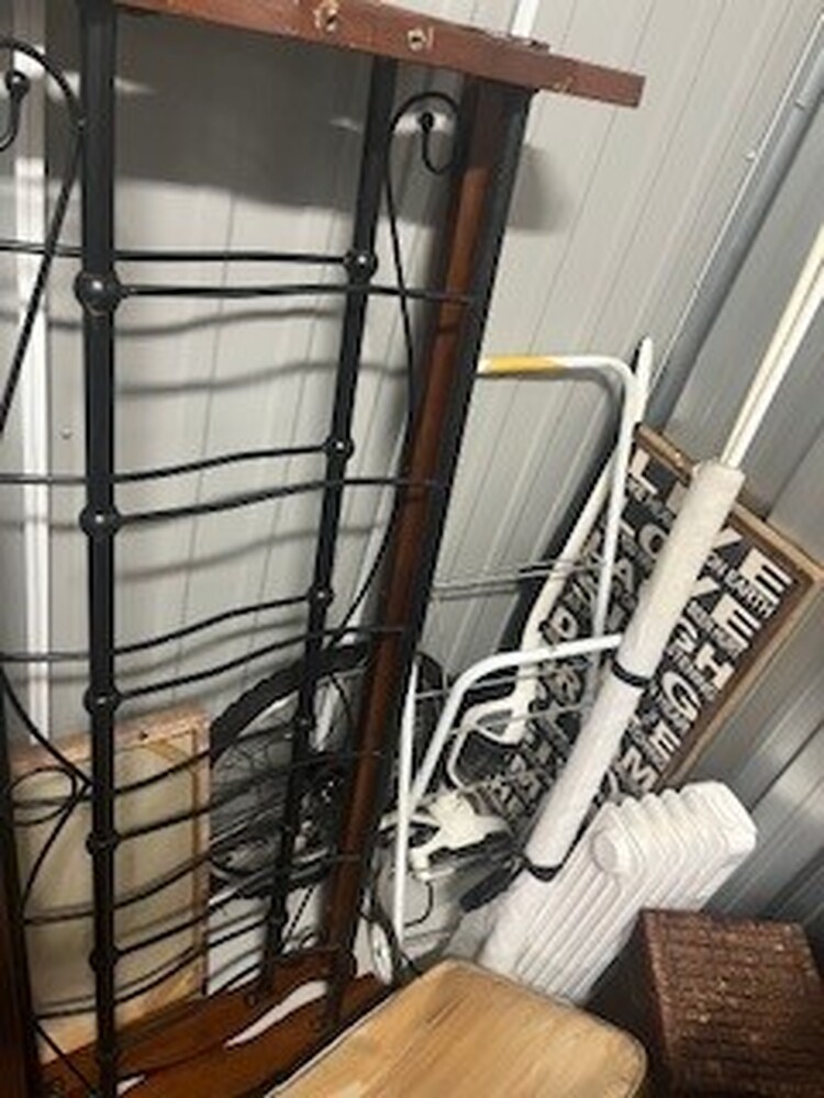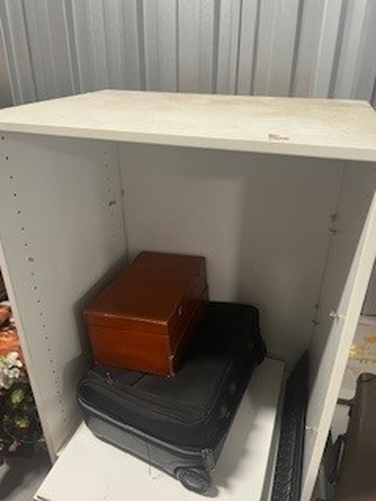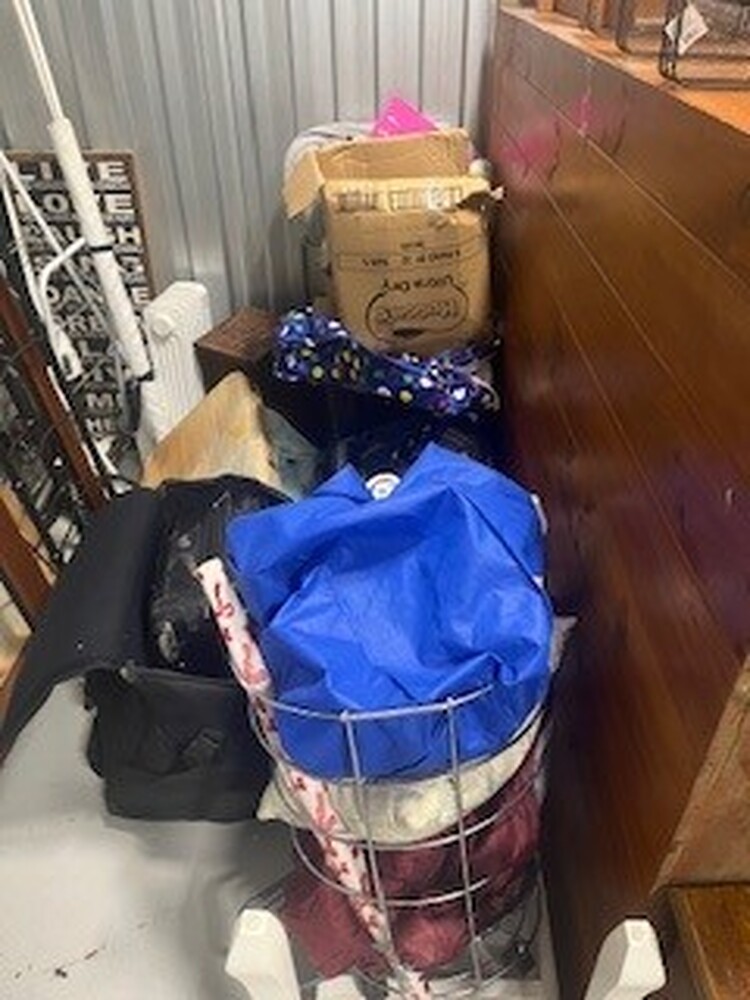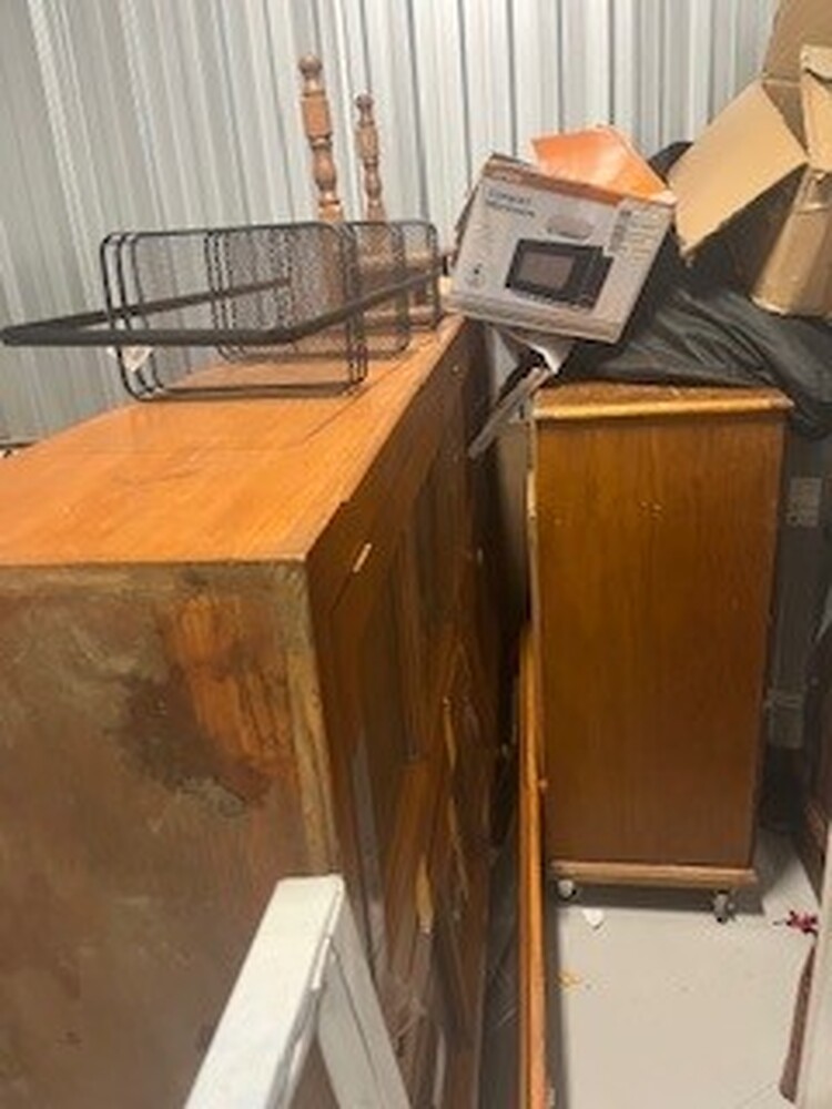 Large Cabinet, side table, office chair, double bed base, suit cases, tv, misc bags, heater, misc house decor paintings, tall boy, vacuum
