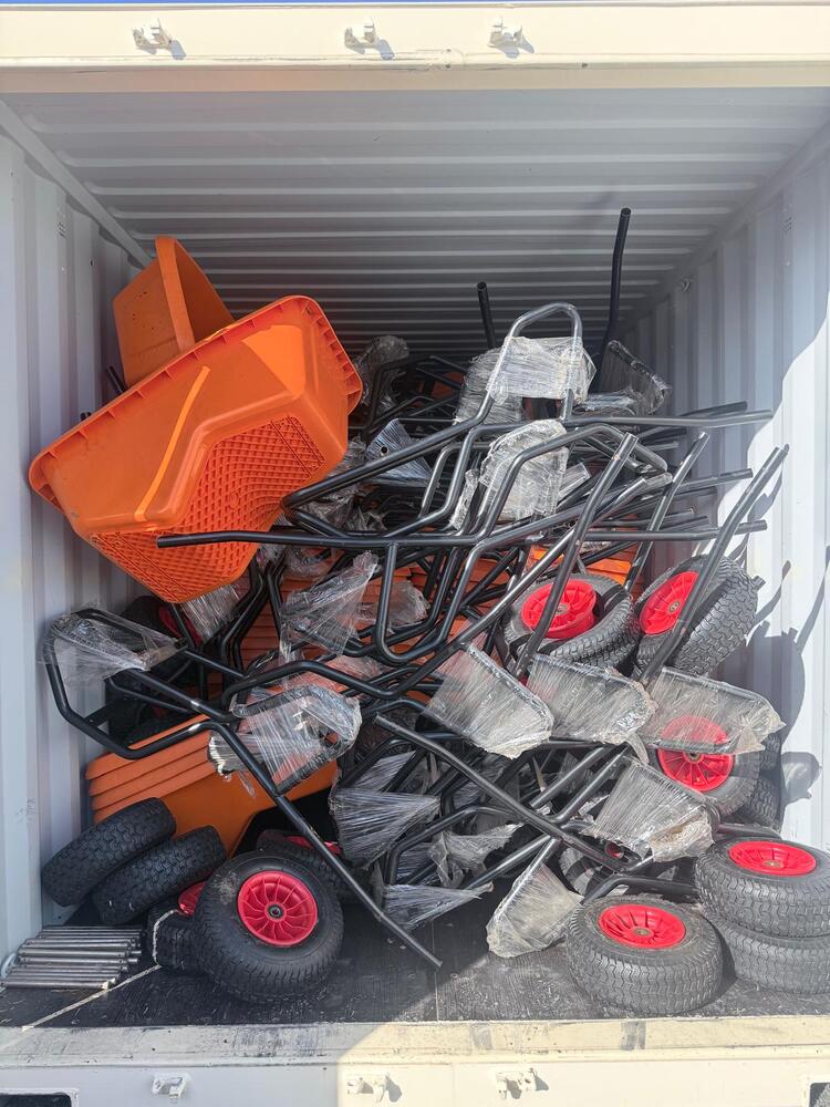 Full of brand new wheel barrows. Assembly required, looks like all parts required are in container as well.
