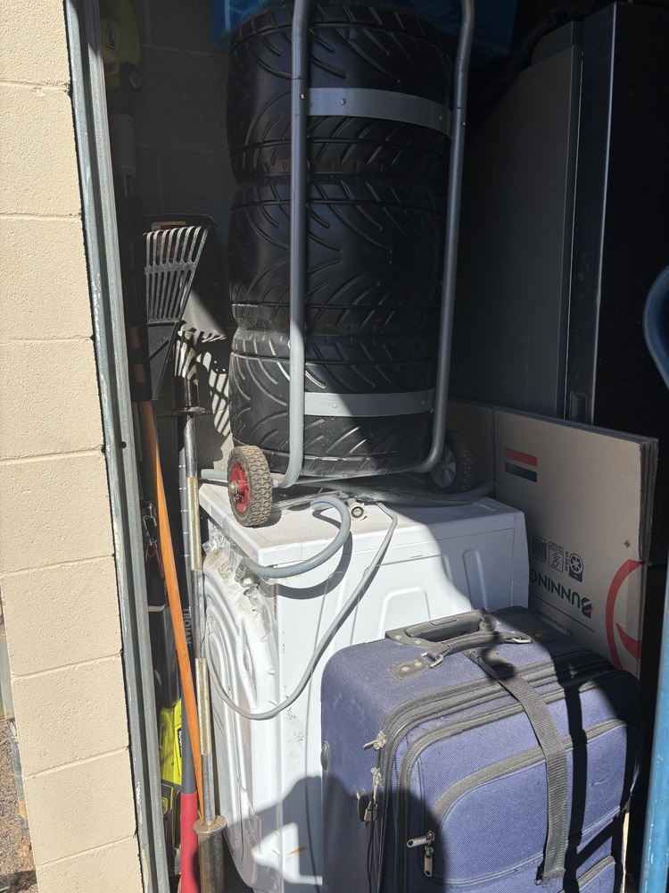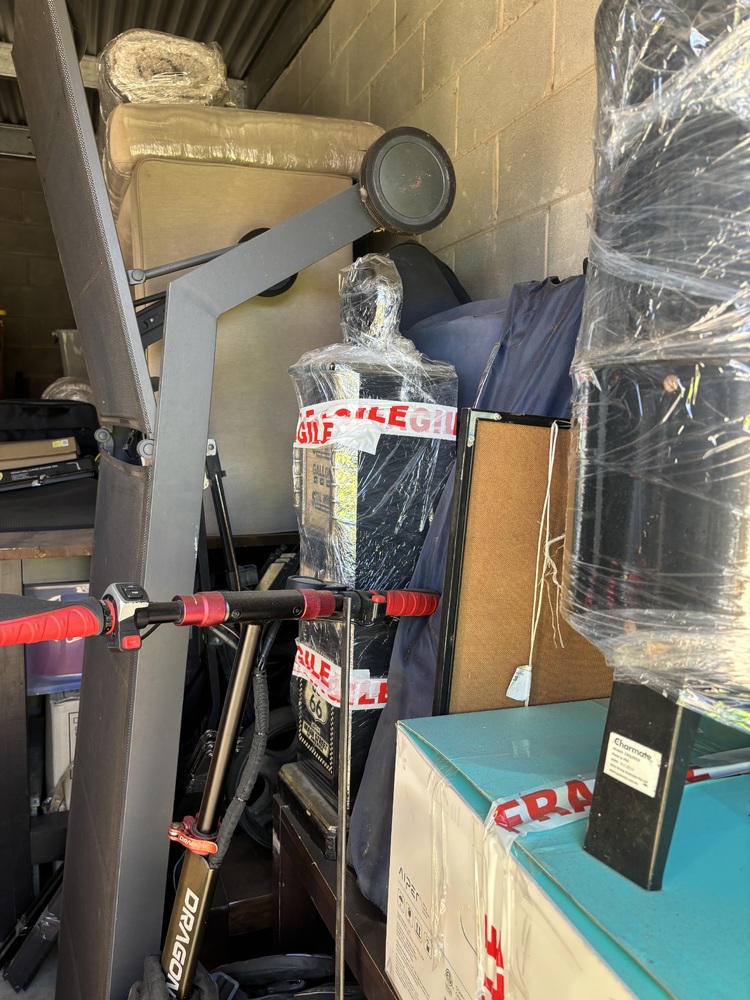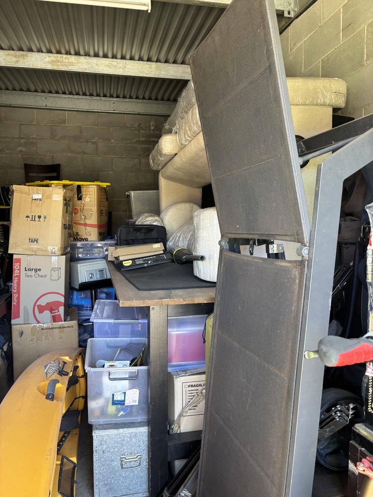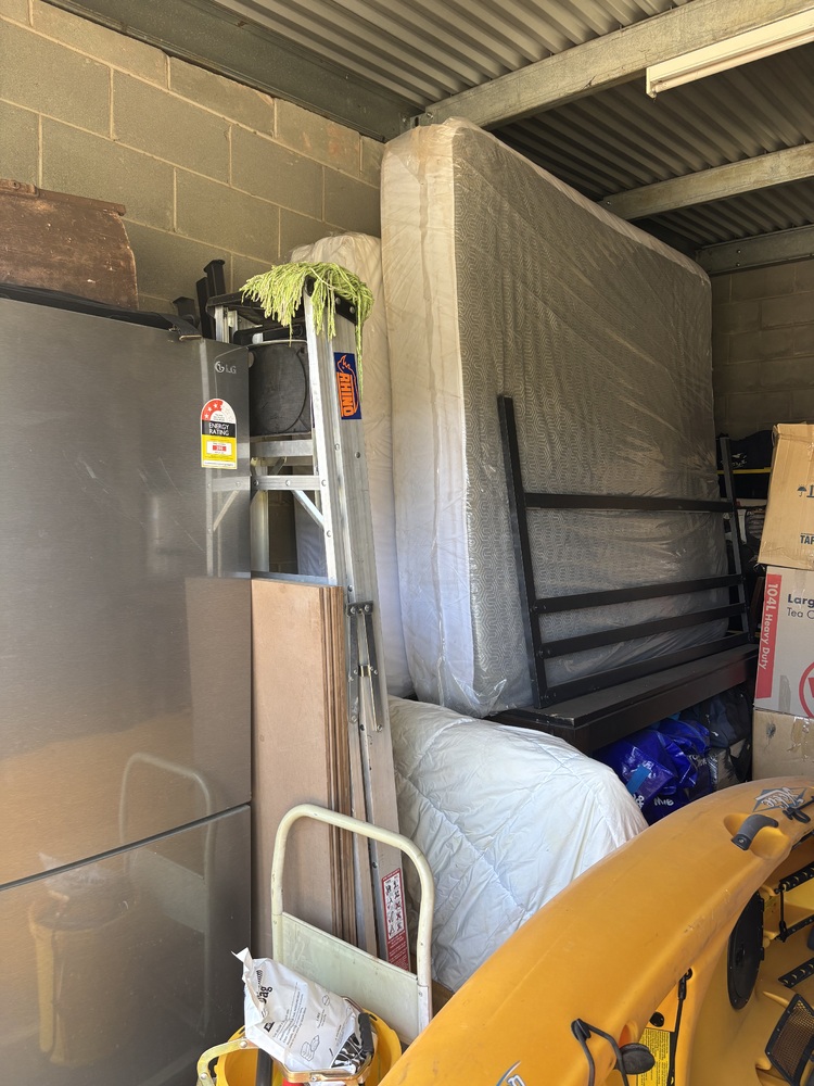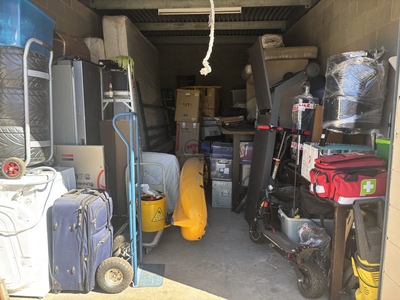 From what we can see there is a sofa, furniture trolly, front load washing machine, an upside-down fridge / freezer, a large work bench / outside table, what appears to be a king size bed, First Aid Kit, Electric scooter, outdoor lounge on wheels, outdoor gardening tools, a ladder, boxes with various unknown items and many more various items.