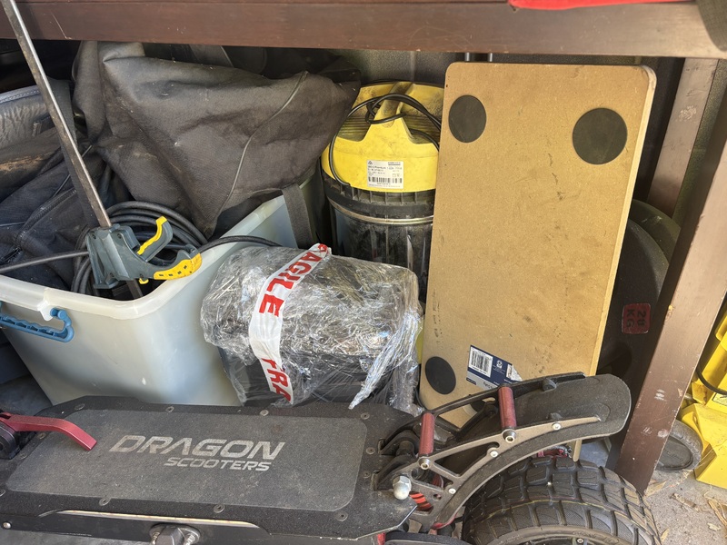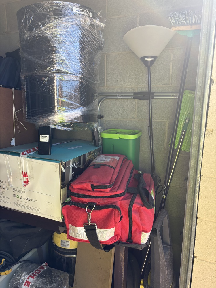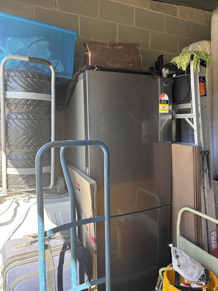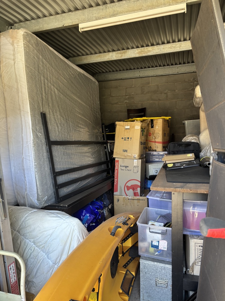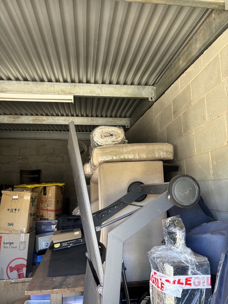 From what we can see there is a sofa, furniture trolly, front load washing machine, an upside-down fridge / freezer, a large work bench / outside table, what appears to be a king size bed, First Aid Kit, Electric scooter, outdoor lounge on wheels, outdoor gardening tools, a ladder, boxes with various unknown items and many more various items.