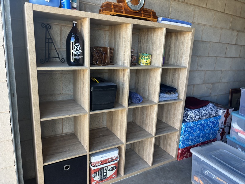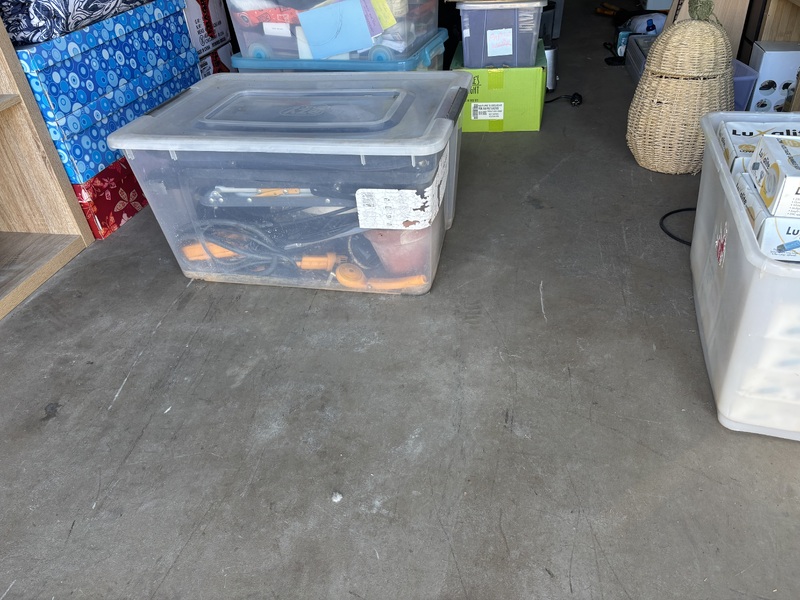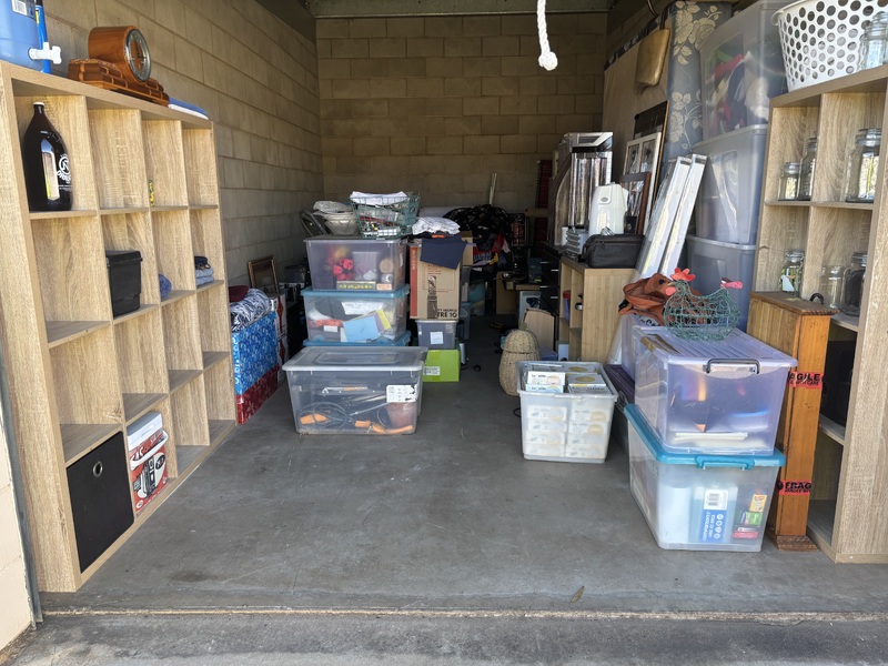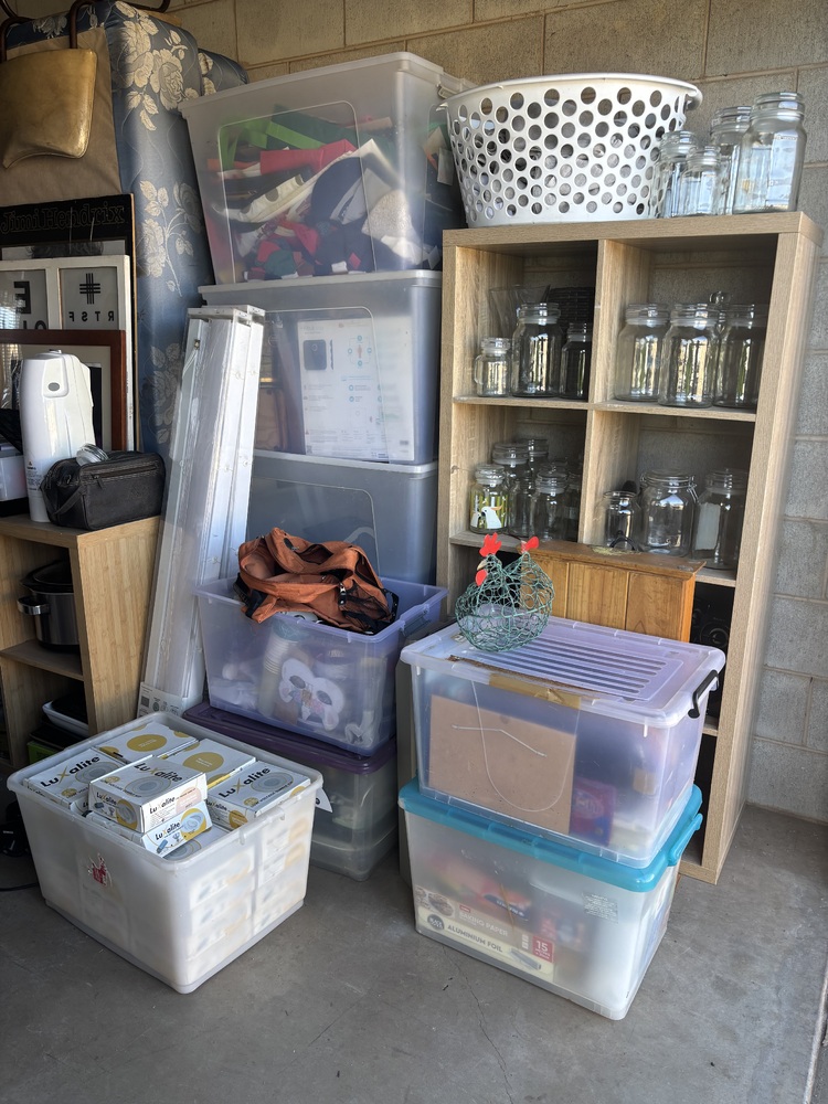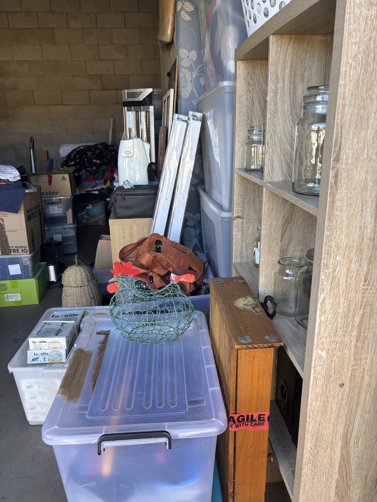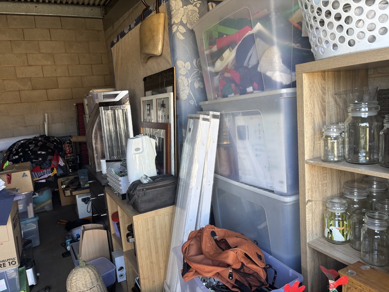 From what we can see there are various plastic containers with mixed items, cube shelving, vacuum cleaners, Glass jars, picture frames, what looks like a small TV, some collectables, maybe a Queen size bed, other mixed various items.
