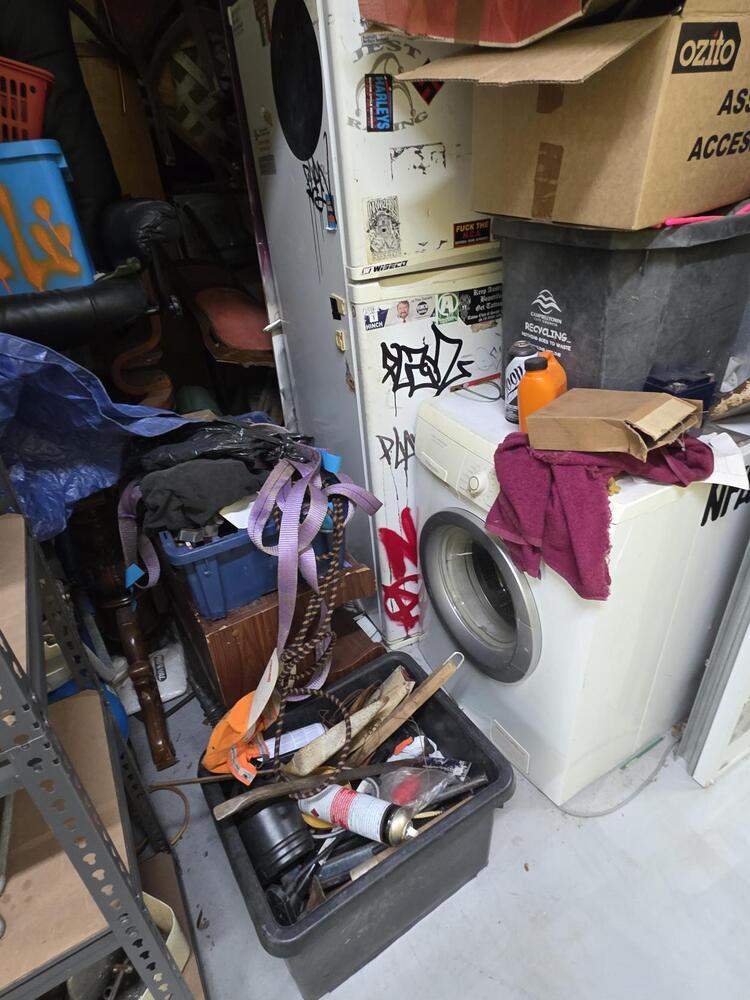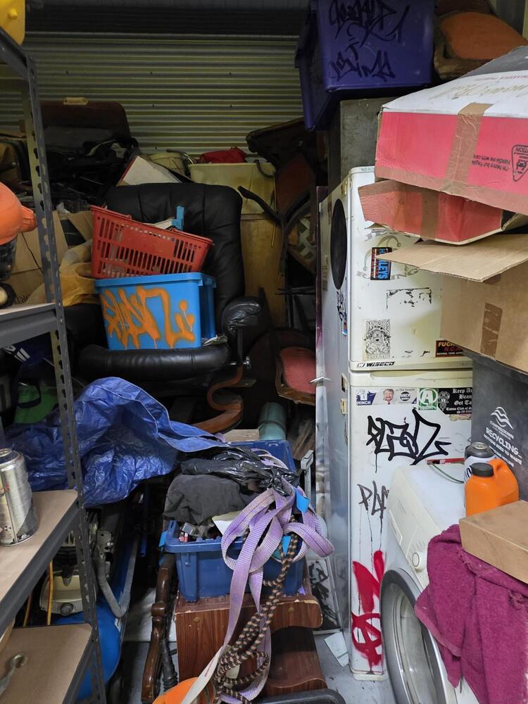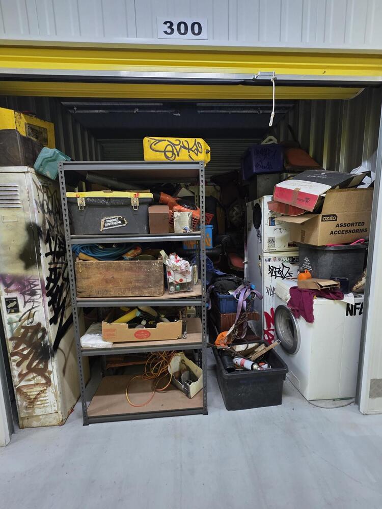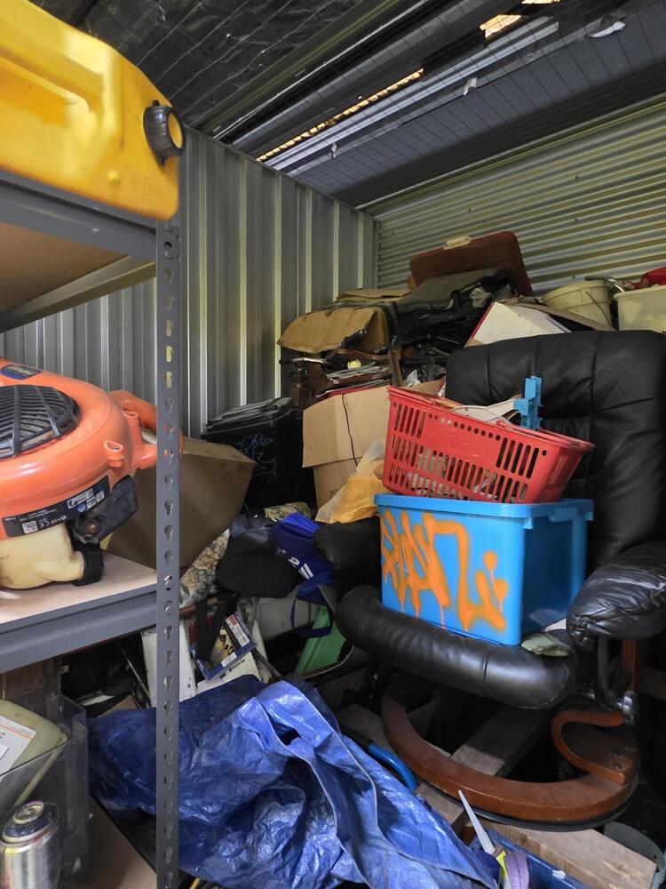 From what we can see inside this unit we have,washing machine, fridge, household items, bags etc. We could not see all the way in so who knows what else might be in this unit…