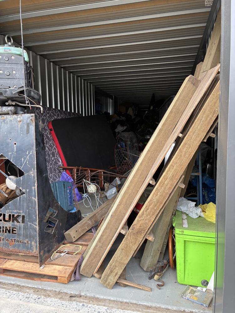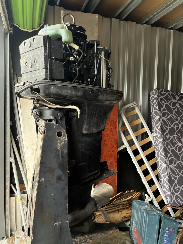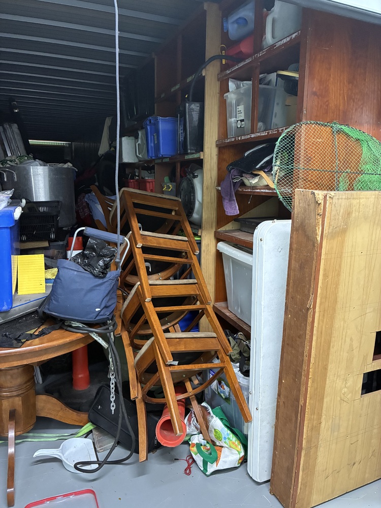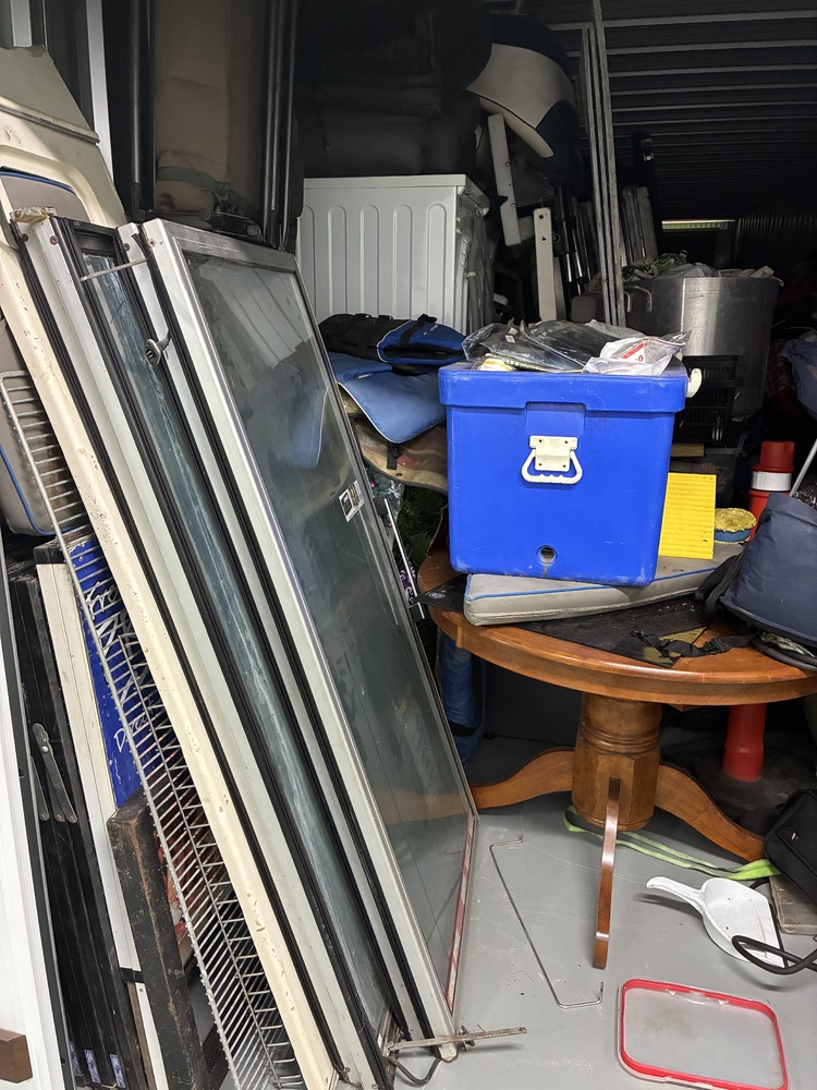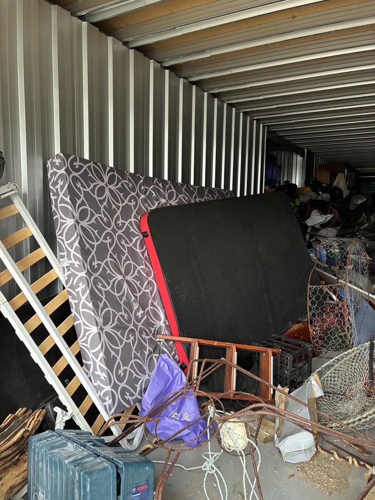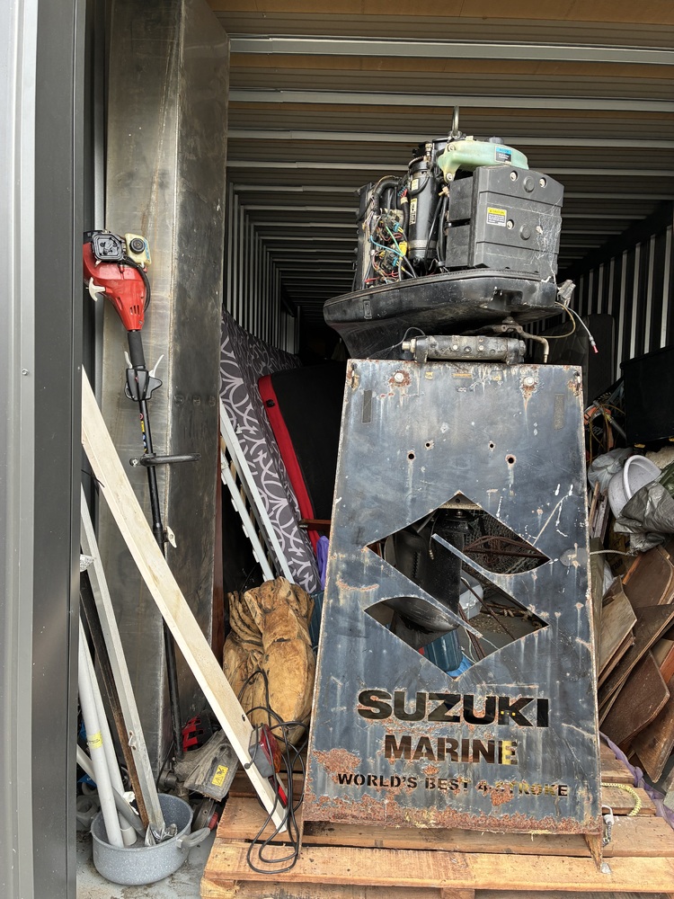 Boat motor, whipper snipper, timber, mattresses, fishing nets, containers, table, white goods, chairs, shelving, large cooking pot.