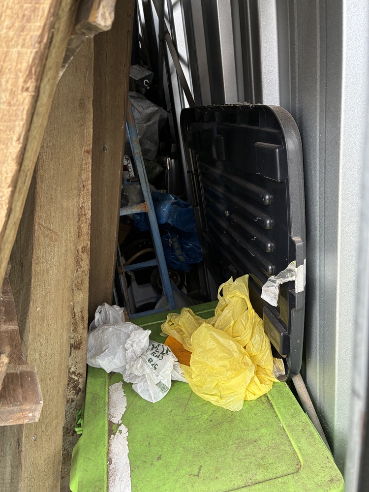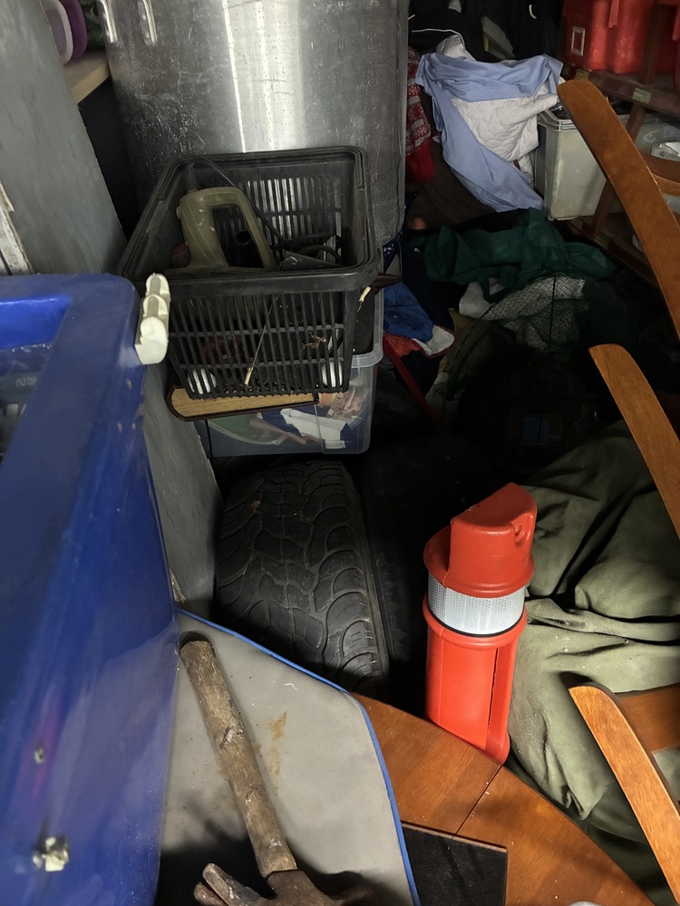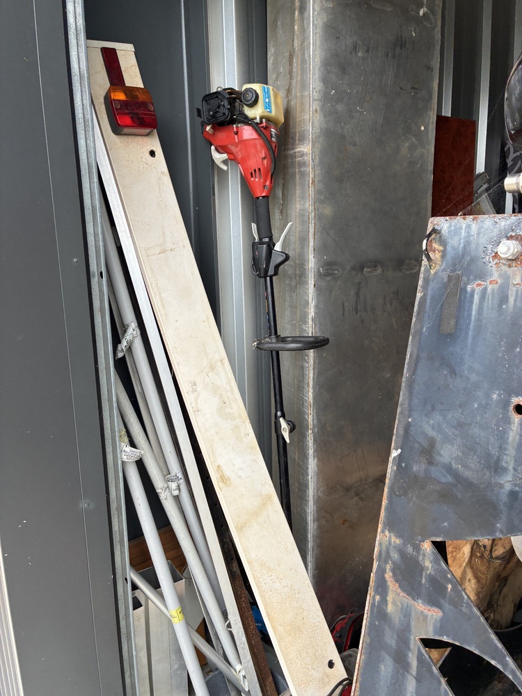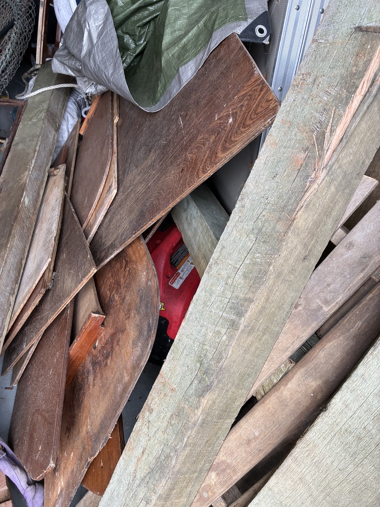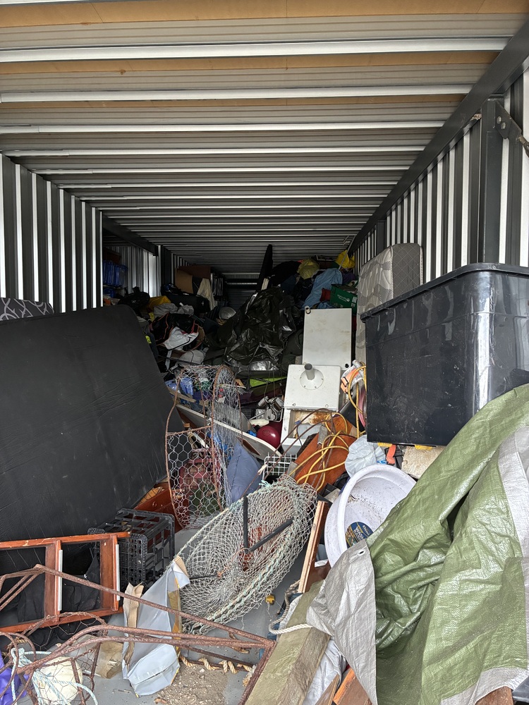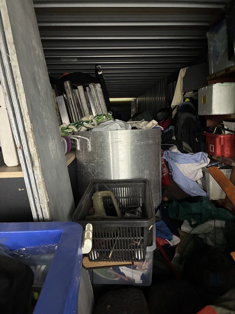 Boat motor, whipper snipper, timber, mattresses, fishing nets, containers, table, white goods, chairs, shelving, large cooking pot.