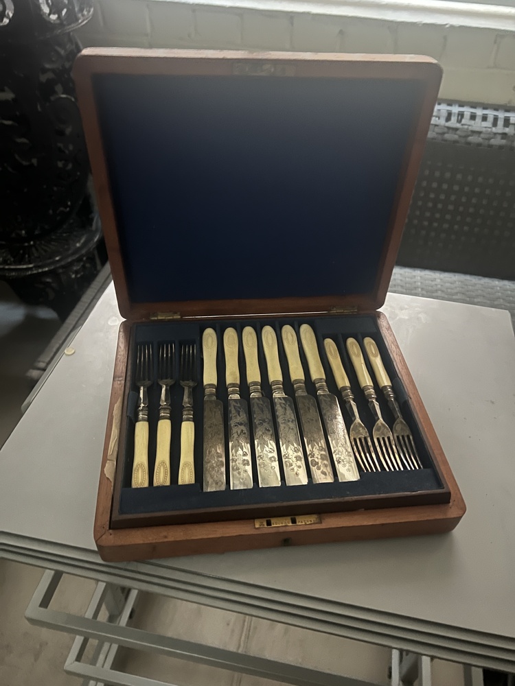 see photos for description - but seems to be an antique music piece with spare needle and record ... looks very interesting. Also accompanied by a set of original and possible ivory handled (?) cutlery in original box.!!