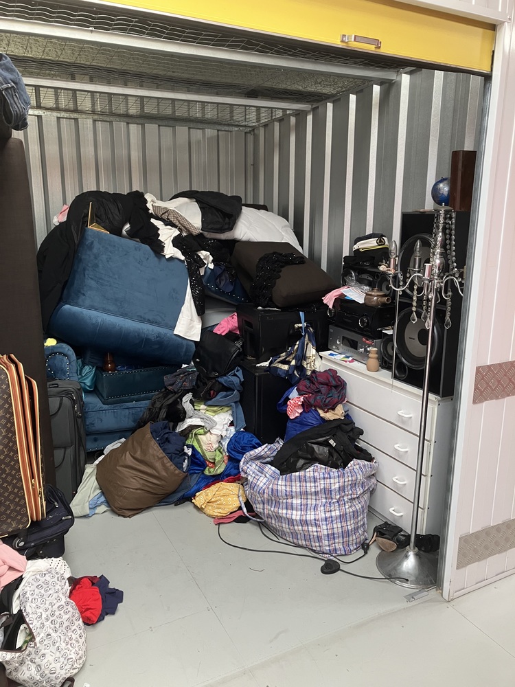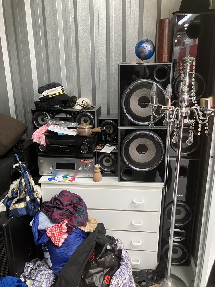 Unit contains household goods including Sony Speakers, Suitcases, couches, amps and two large speakers. A large amount of clothing and bags/baskets.