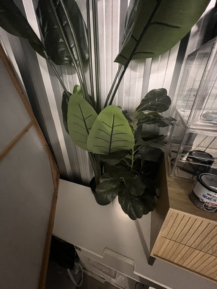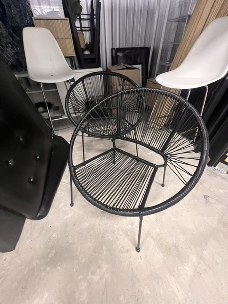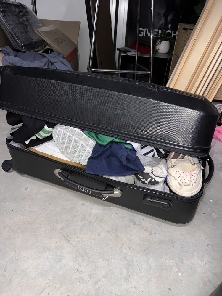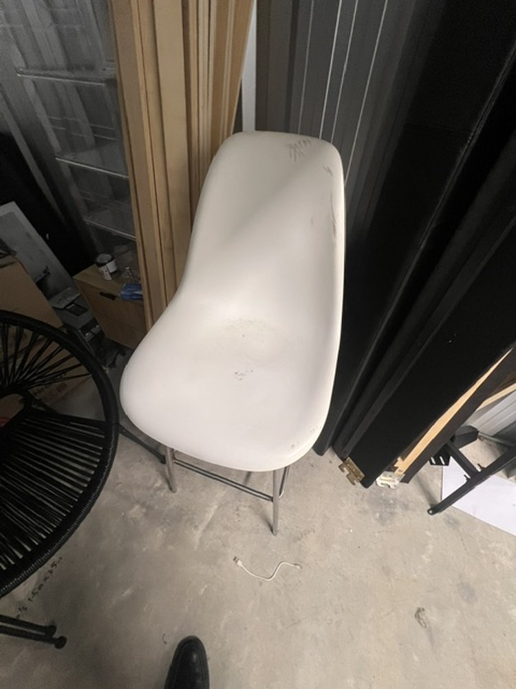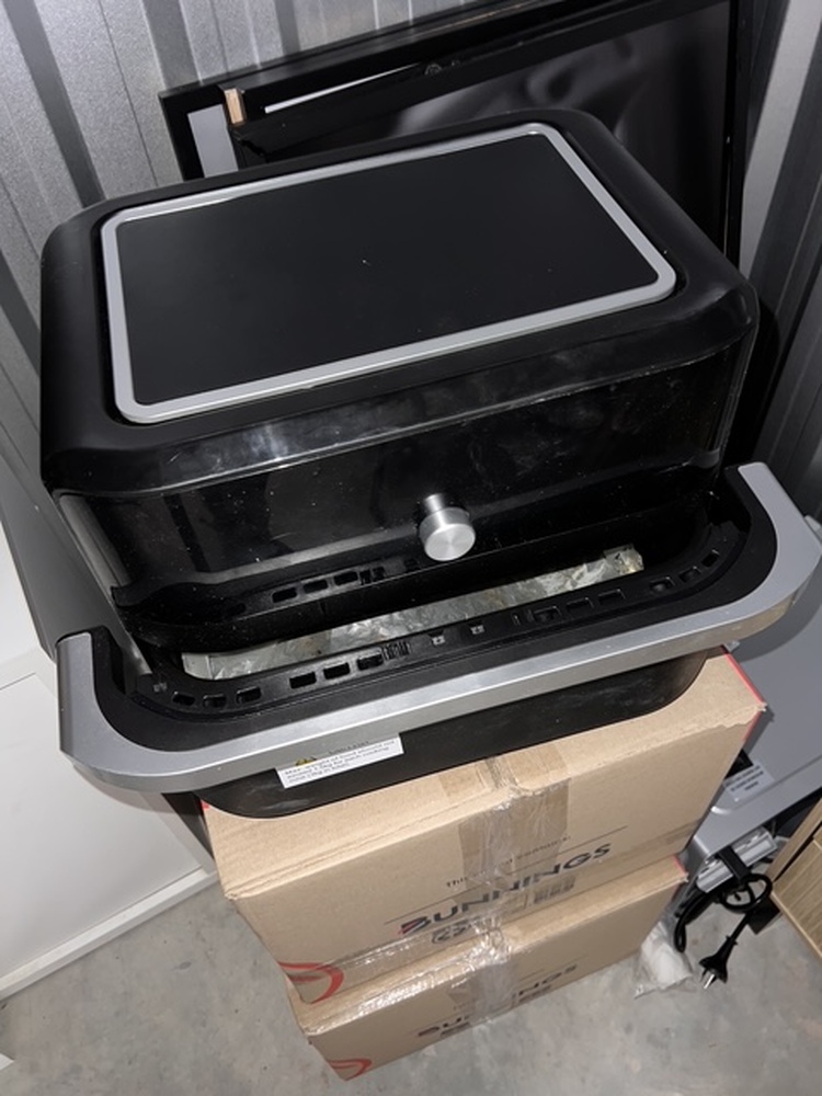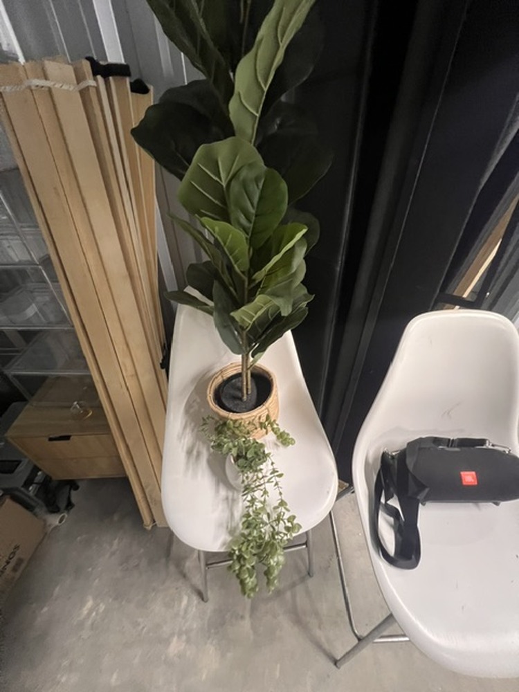 Bike bed frame two white seat chairs clear plastic containers black outdoor cane furniture two bedside tables one TV unit white car cleaning kit queen mattress and small mattress leather look bed head black shoes JBL portable speaker air fryer imitation plastic plants heat gun hairdryer hair straightener black barstools iron and ironing board kitchen appliances and kitchen utensils first aid kit soft furnishings numerous prints Dremel tool kit accessories microwave black suitcase full of men's clothing and footwear assorted small items with minor value.