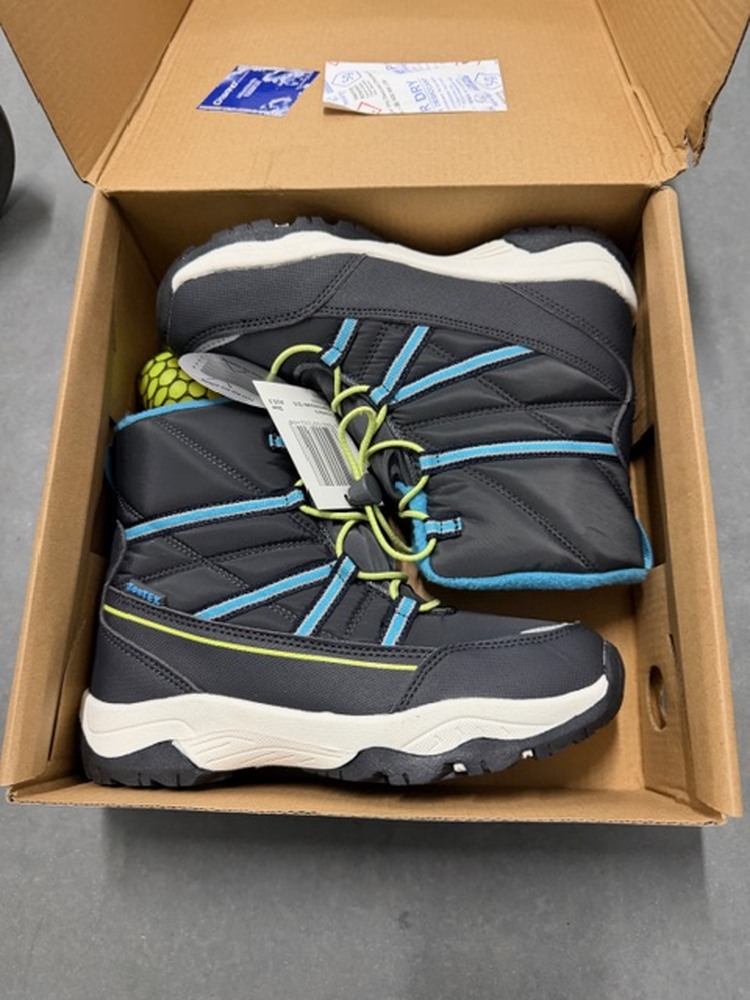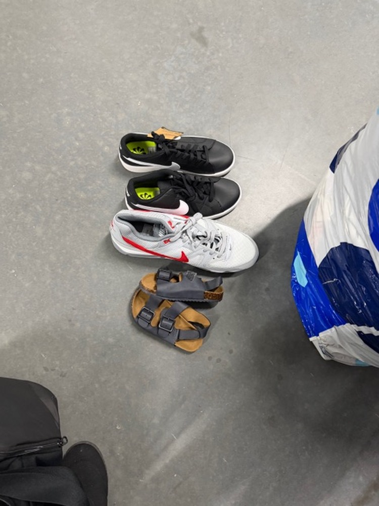 Boxes and bags of items such as shoes, towels, books, paper plates, toys, blanket, drink bottle