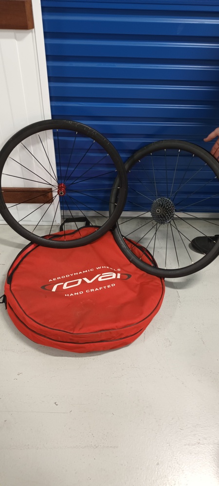 Two bicycle race wheels with carry holder. Handcrafted Roval aerodynamic.