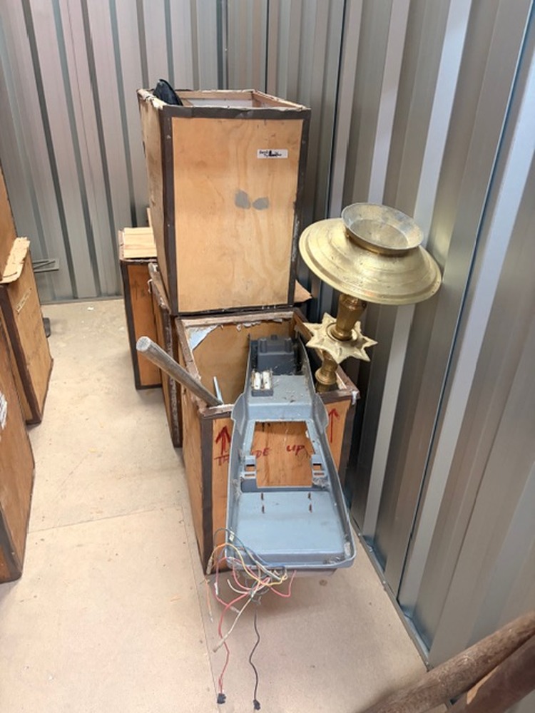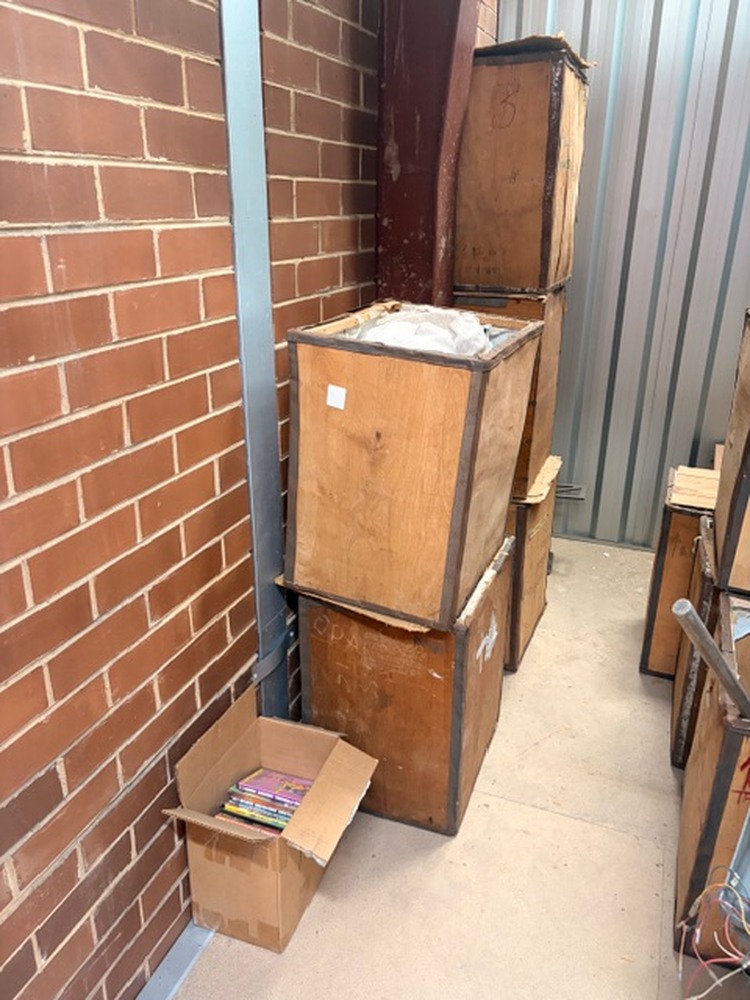 Multiple large wooden storage crates (approx. 8 units)